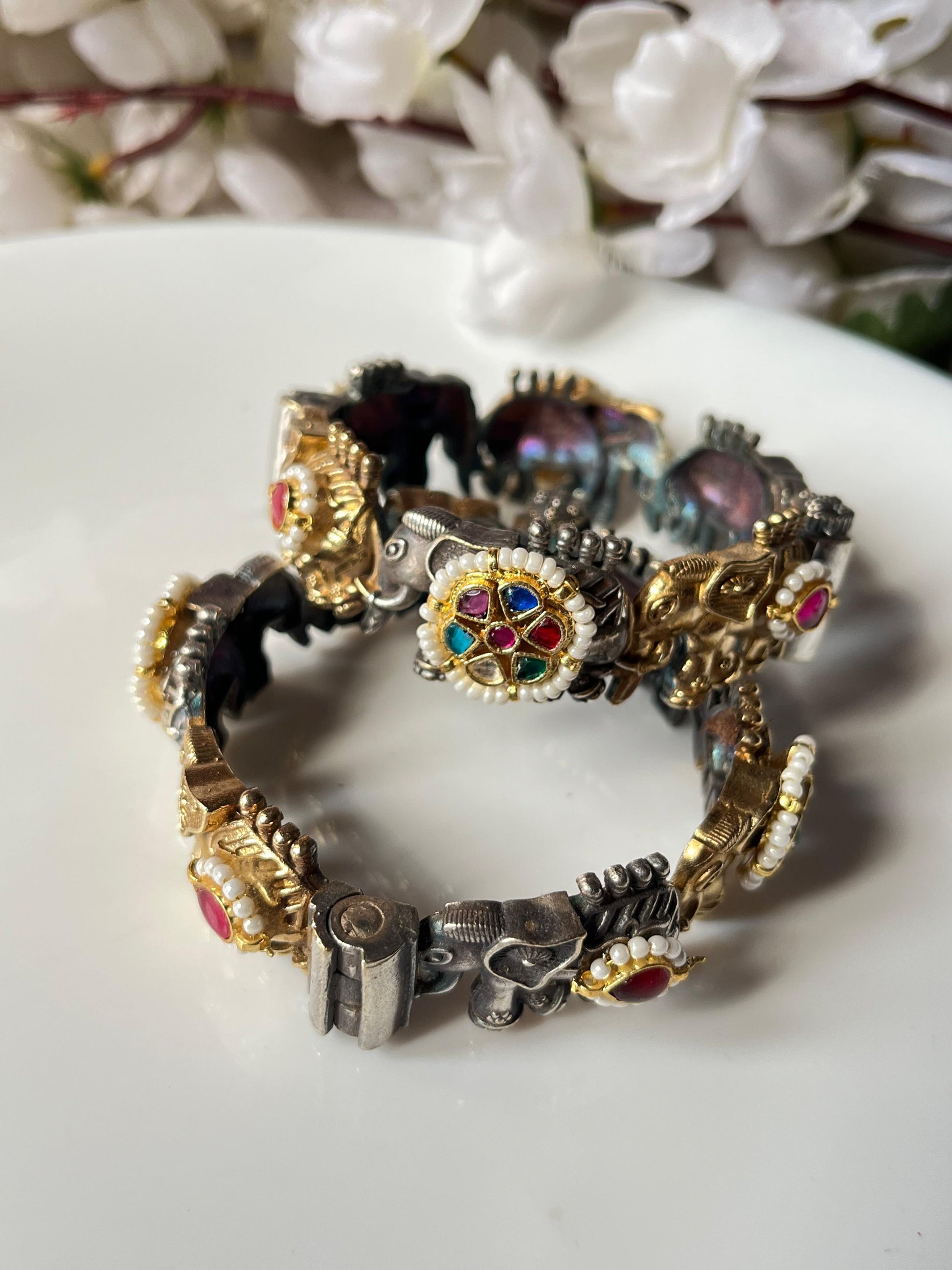 Designed ethnic kada features colorful Kundan stones and pearl accents for a graceful touch.