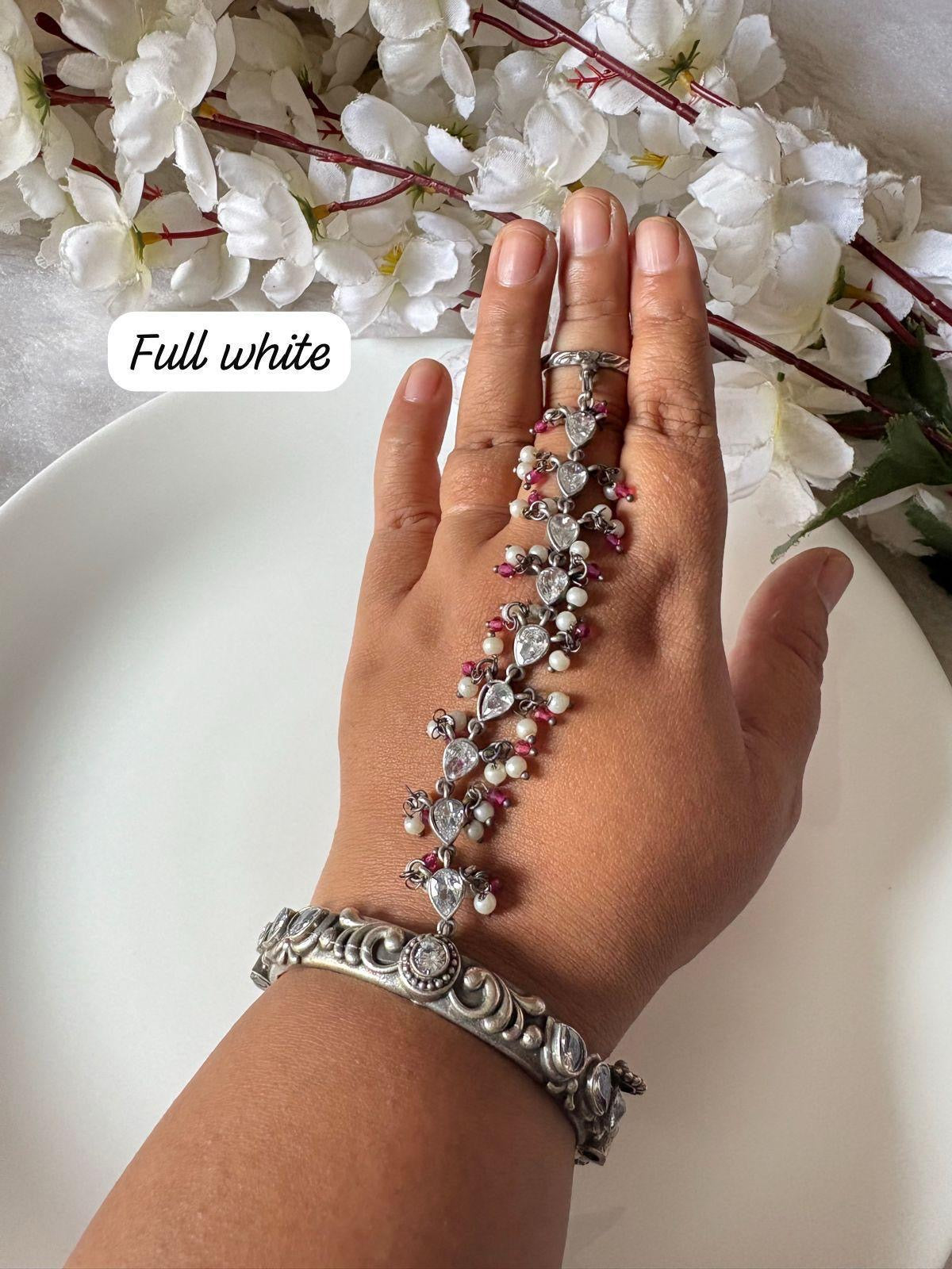 Antique Silver Haathphool with Turquoise & Pearls – A stunning hand ornament crafted with turquoise stones, pearls, and pink accents, perfect for weddings, festivals, and traditional occasions.