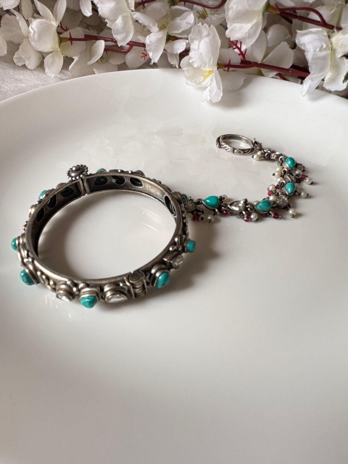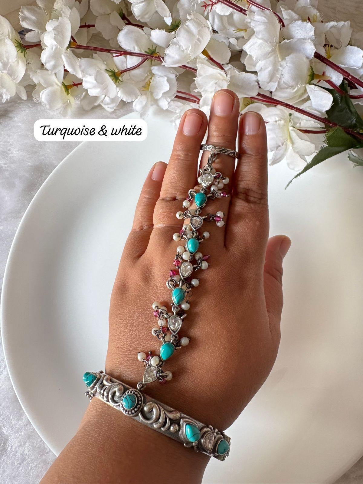 Antique Silver Haathphool with Turquoise & Pearls – A stunning hand ornament crafted with turquoise stones, pearls, and pink accents, perfect for weddings, festivals, and traditional occasions.