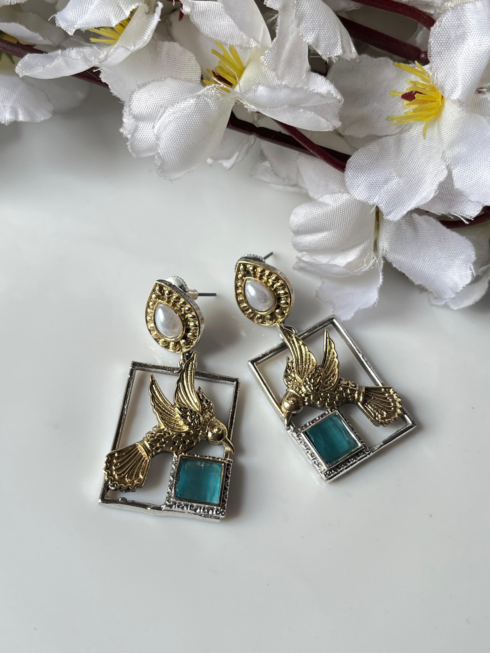 These dual-tone earrings showcase a modern frame design with a flying bird motif. Embellished with vibrant turquoise and pink stones, they’re perfect for adding a playful yet elegant touch to your style.