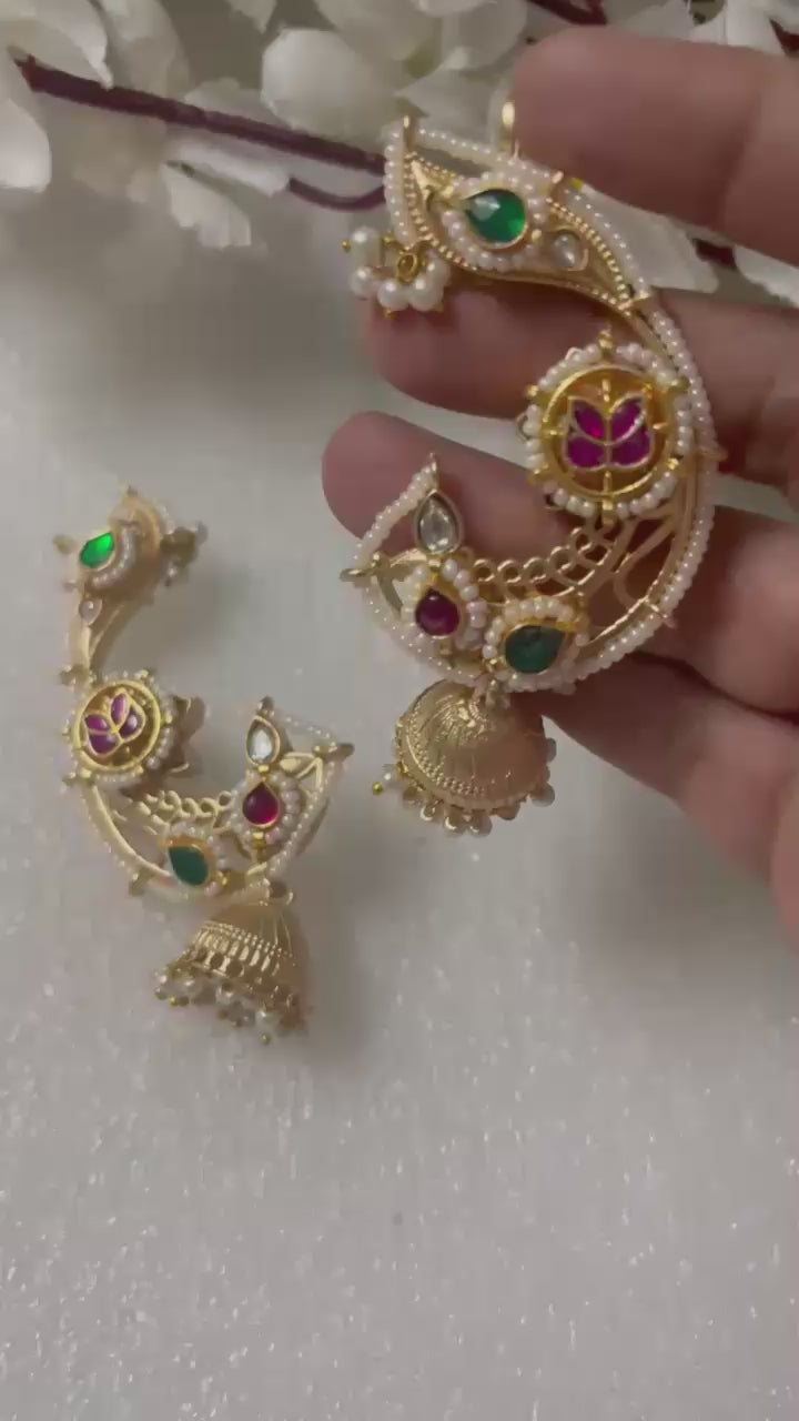 Adorn yourself with these royal lotus-inspired crescent earrings, featuring pearl accents, colorful stones, and gold-plated elegance.