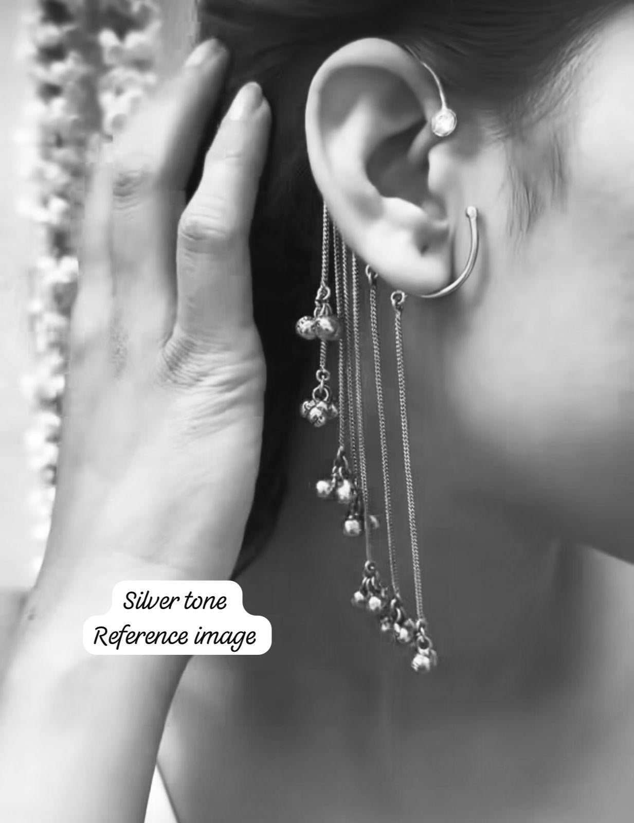 long ear cuff with golden chains and ghungroos, perfect to elevate your festive, bridal, or traditional ensemble.