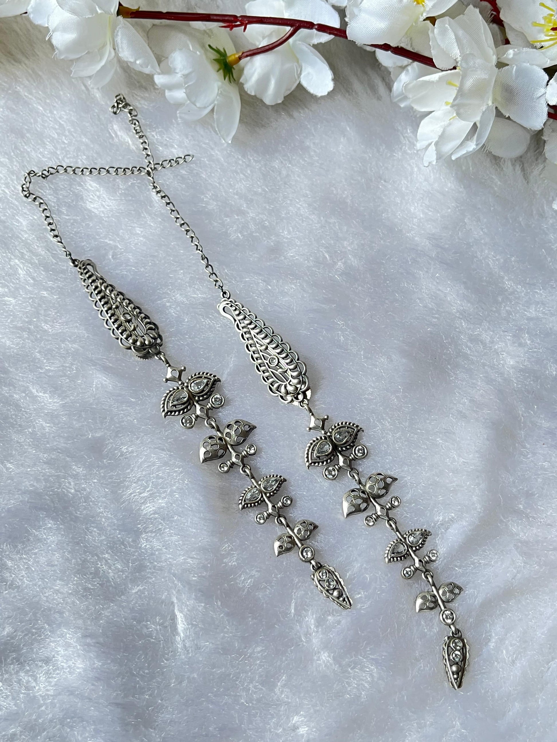 ✨ Elevate your ethnic look with these stunning oxidised long earrings featuring floral and leaf motifs adorned with colorful stones in pink, turquoise, green, and blue. Handcrafted with intricate detailing, these danglers bring a perfect blend of bohemian charm and traditional elegance – ideal for festive occasions, weddings, and everyday ethnic wear.