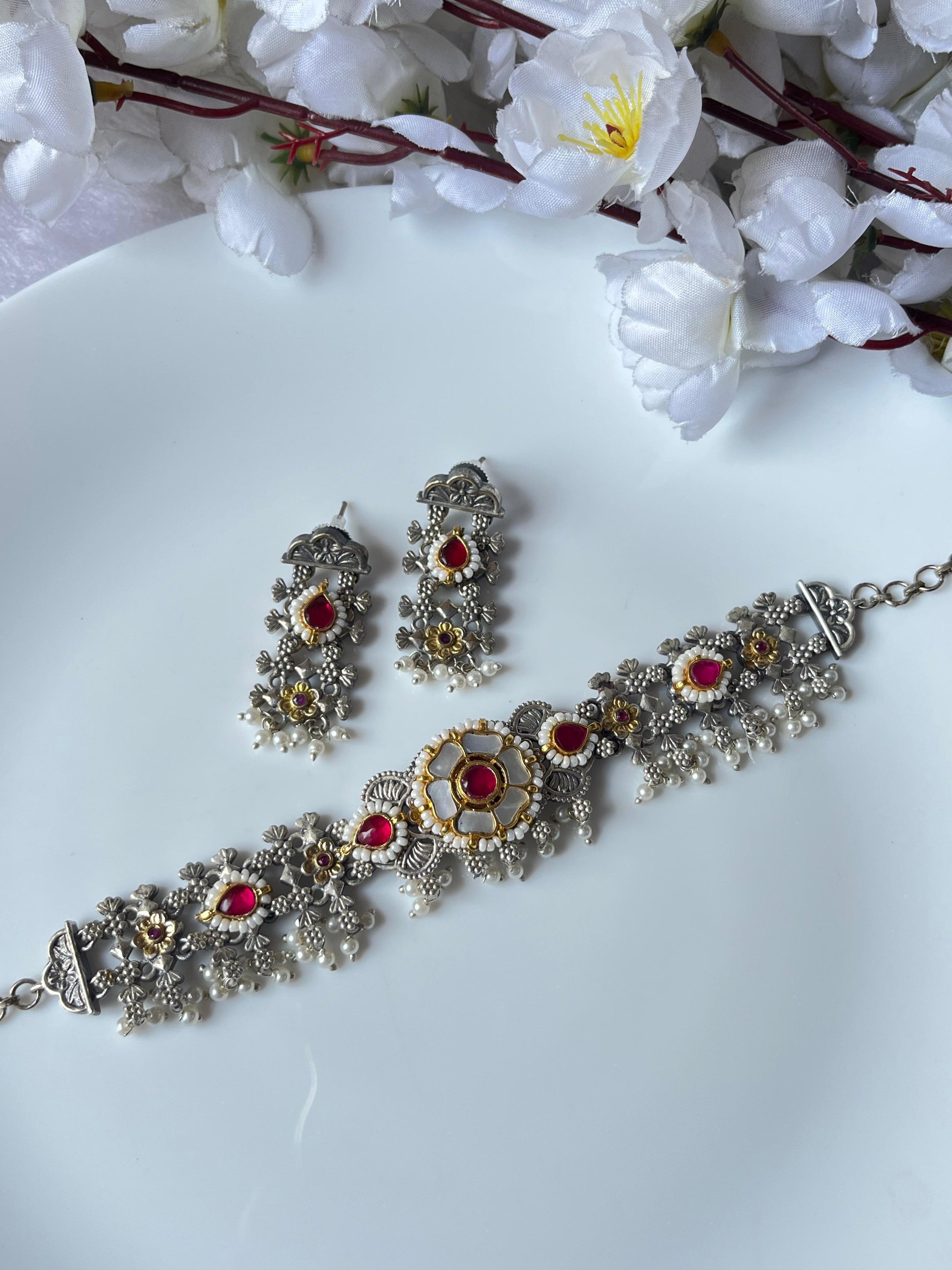 A perfect blend of tradition and elegance, this antique oxidized necklace set comes with intricate detailing and pearl accents.