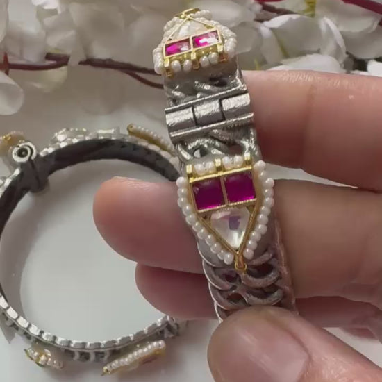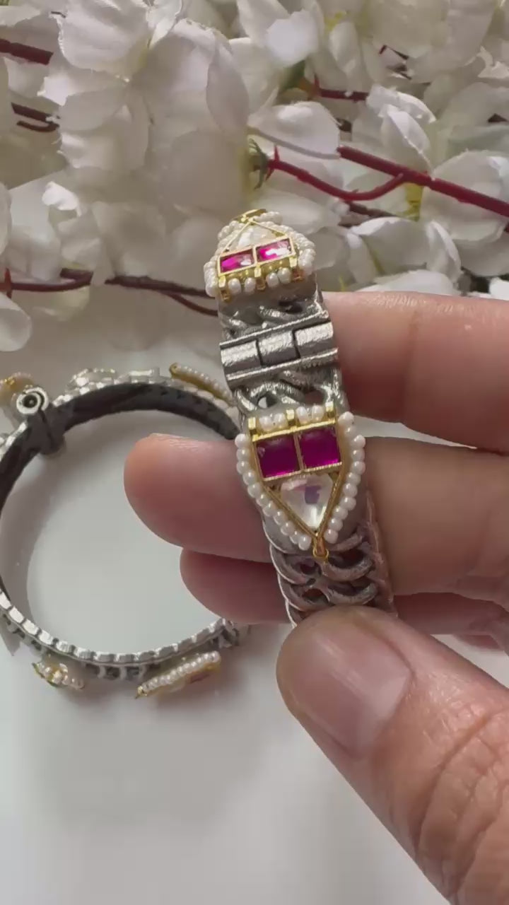 These stunning heritage-inspired bangles showcase detailed craftsmanship with vibrant Kundan stones and pearl accents on an oxidised base, making them a timeless statement piece for every jewellery lover.
