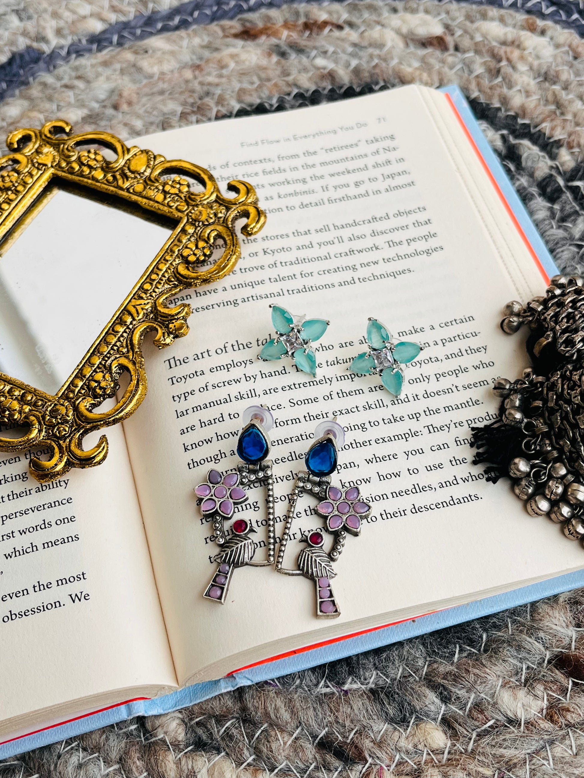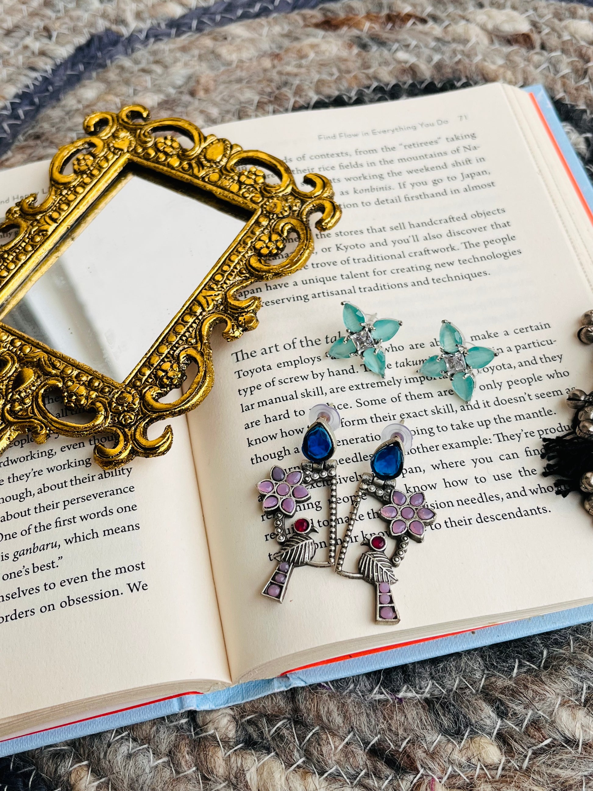 A fusion of folk and fun—these long oxidised earrings feature charming floral motifs, colorful enamel work, and a graceful design perfect for boho and ethnic vibes.