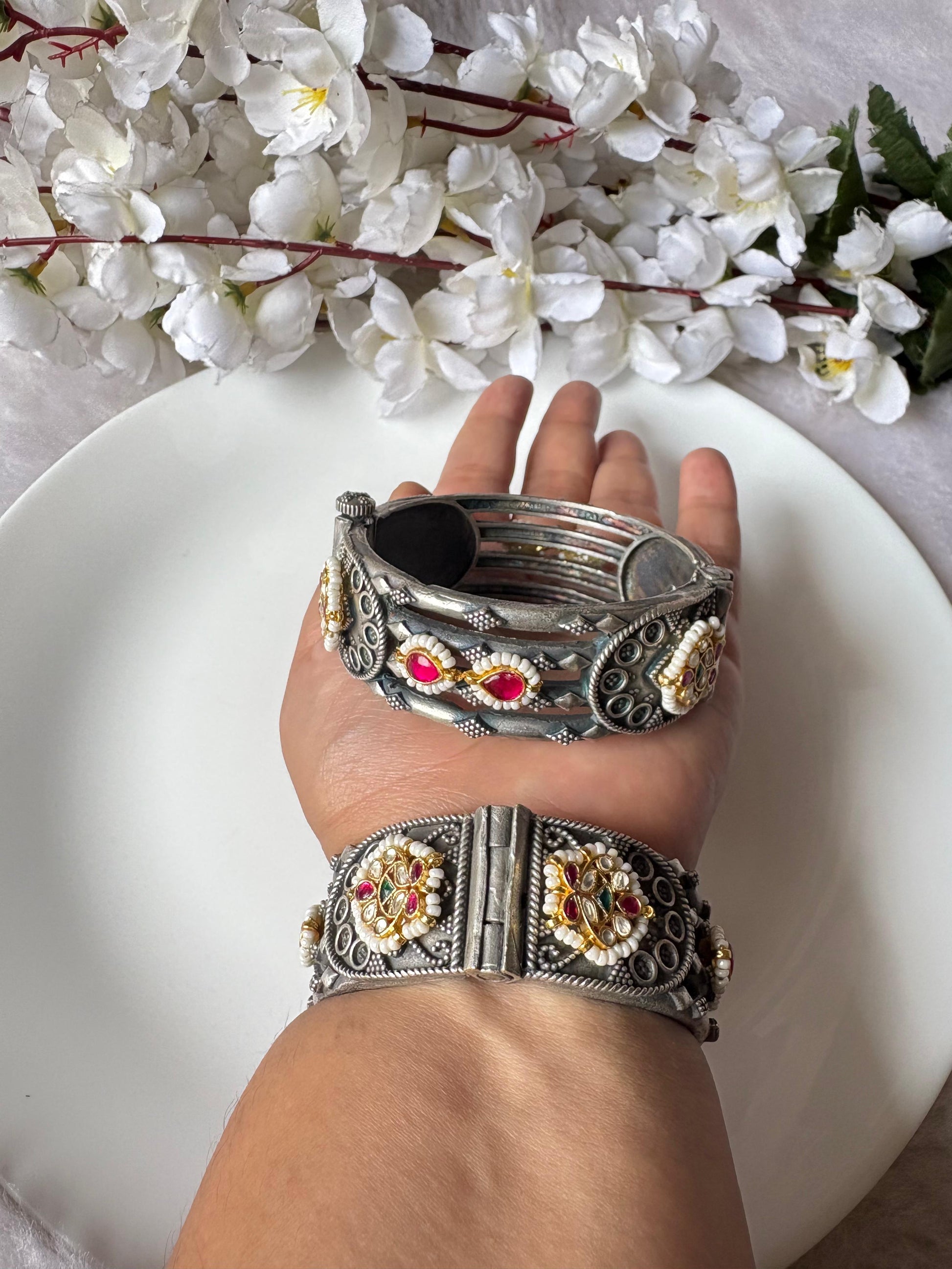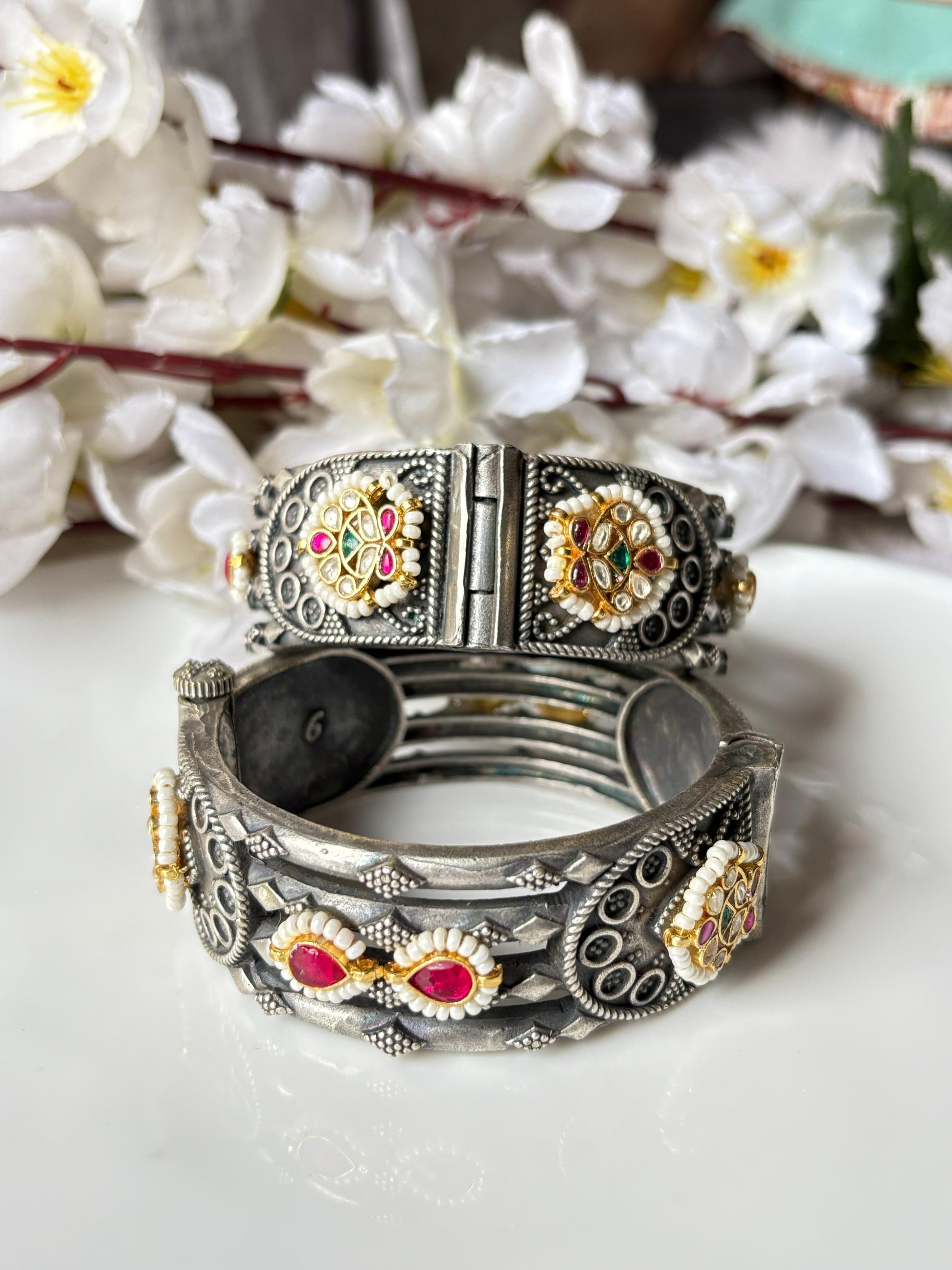 Designed ethnic kada features colorful Kundan stones and pearl accents for a graceful touch.