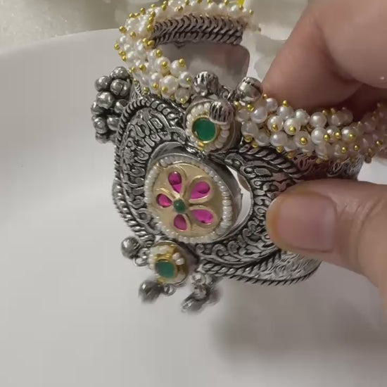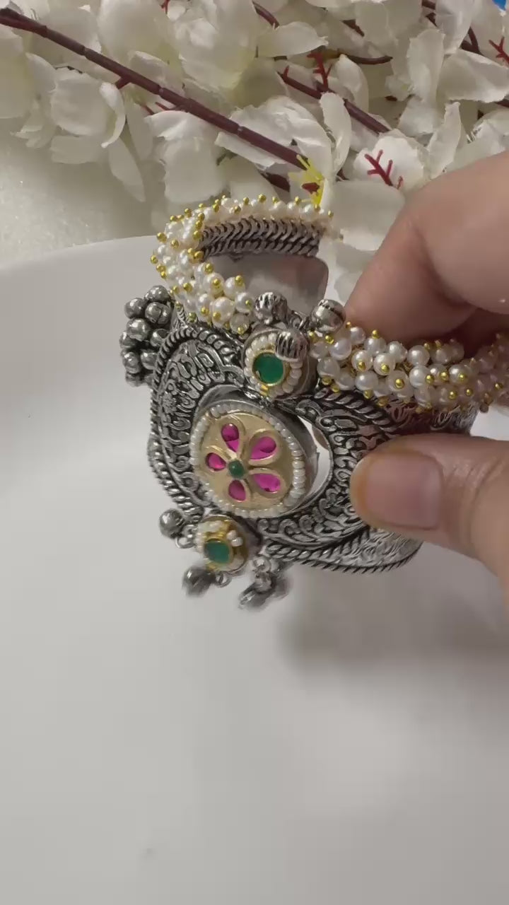 Crafted in premium German silver, this pearl-studded cuff adds a touch of grace to your festive & party look.