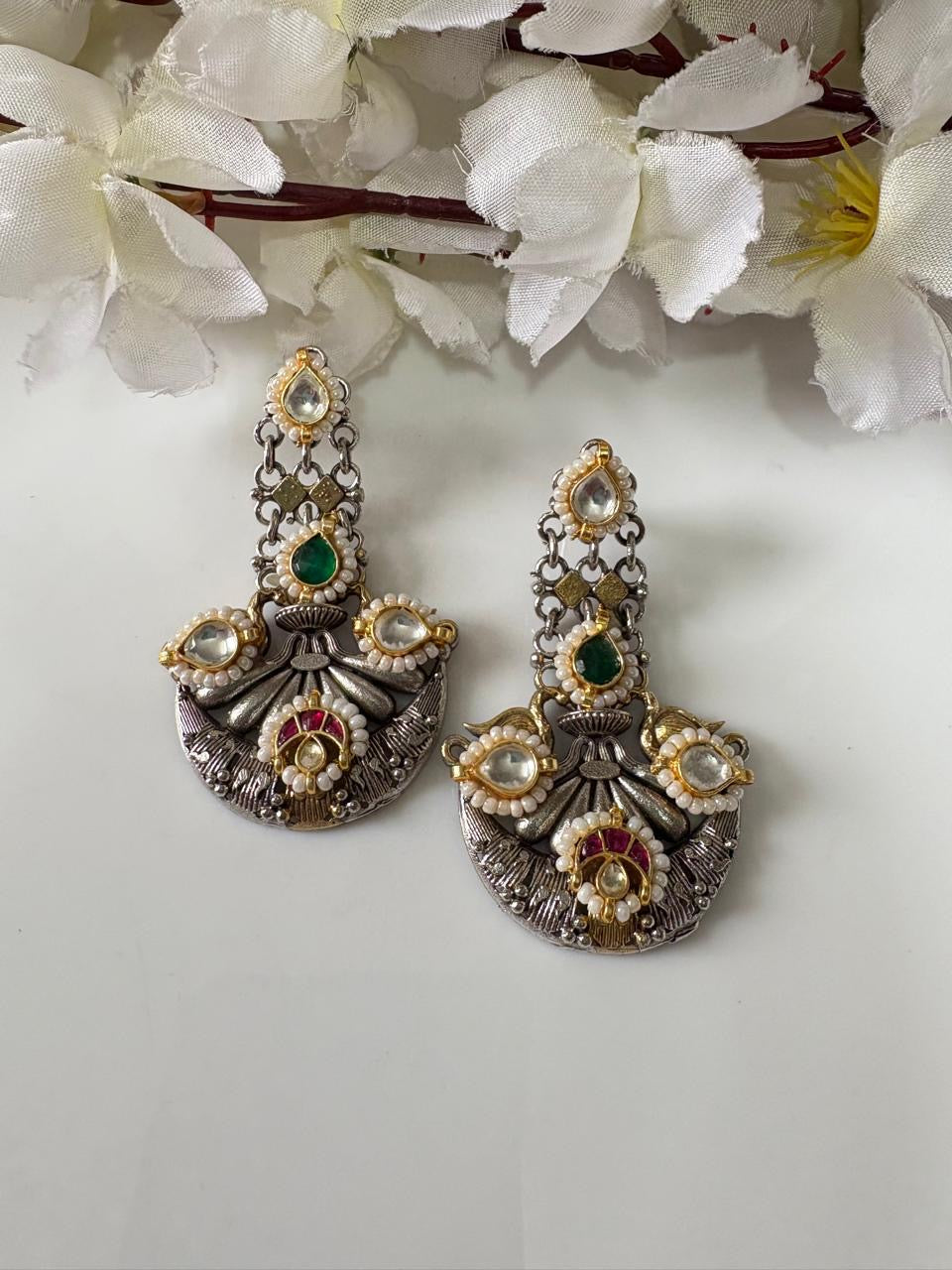 Add a royal charm to your look with these oxidised silver earrings, featuring intricate peacock meenakari work, vibrant enamel colours, and delicate pearl drops.