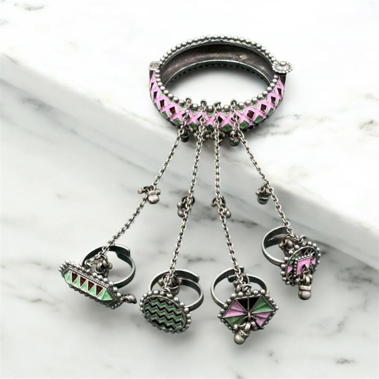 Add a touch of tradition to your festive look with this stunning haathphool featuring antique silver plating, delicate chains, and colorful meenakari work. Perfect for weddings, Navratri, and cultural occasions.
