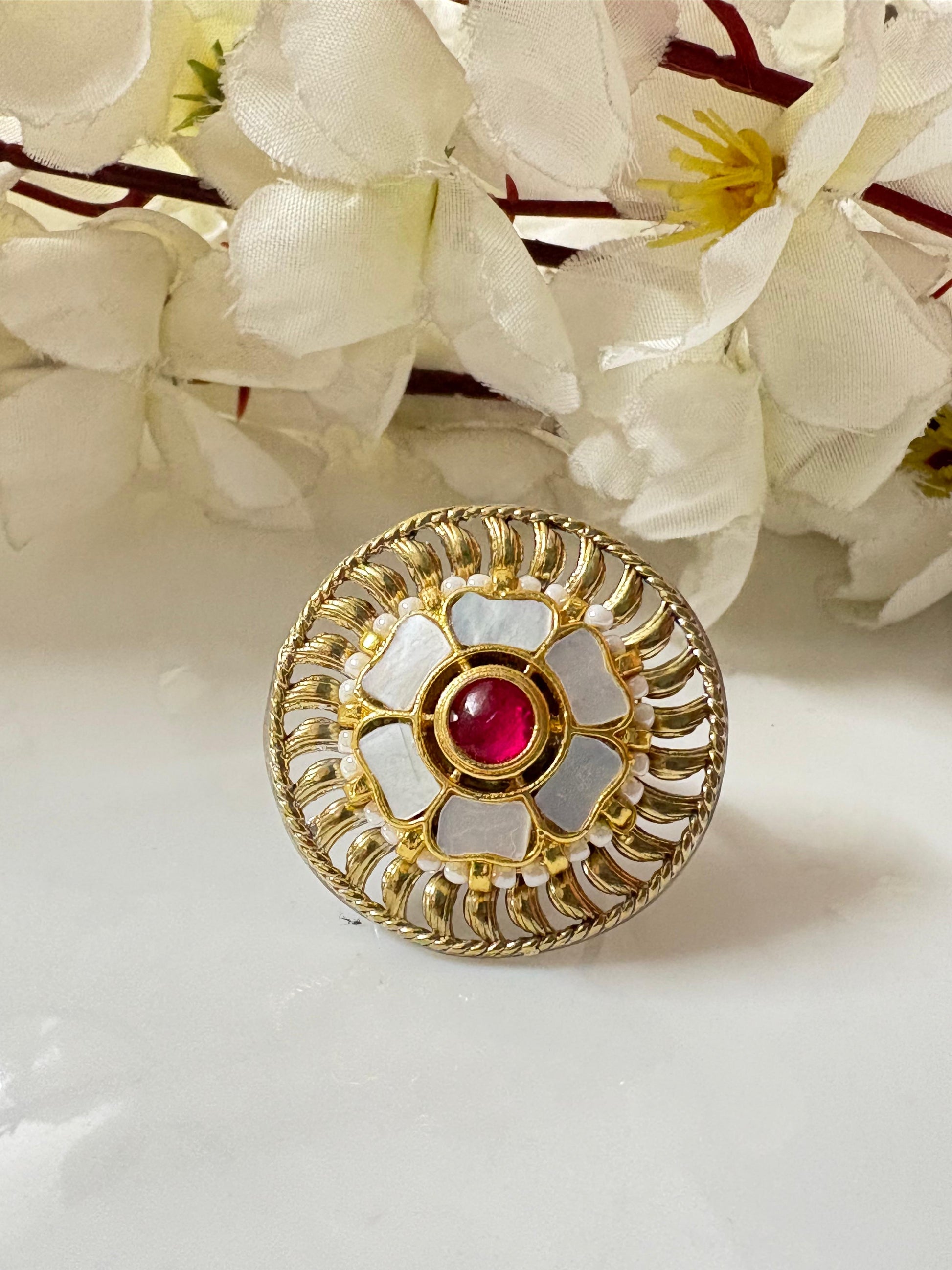 Vibrant handcrafted ring with meenakari work, kundan detailing, pearls, and antique finish. Adjustable, ethnic, perfect for festive elegance.