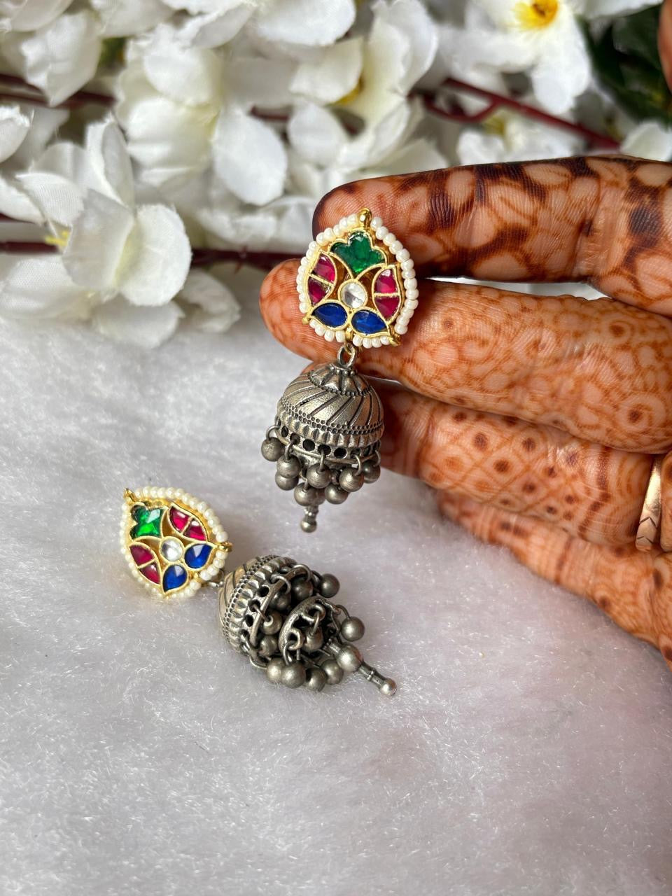 Handcrafted with love, these floral jhumkas are designed with colorful detailing, pearl accents, and an oxidised silver dome for an elegant ethnic touch.