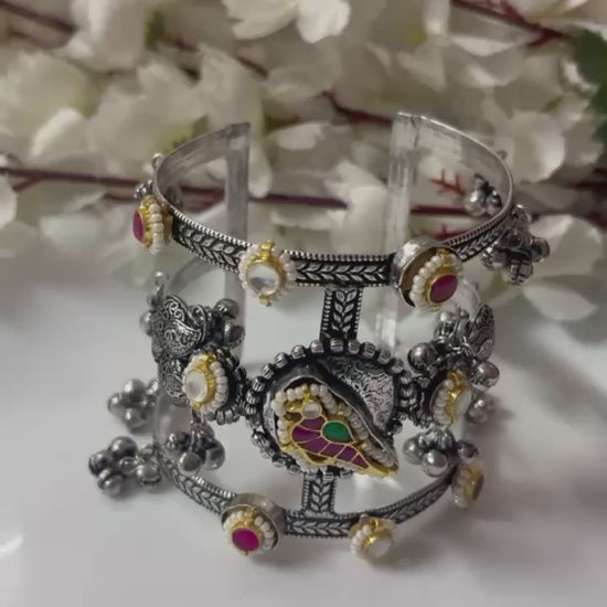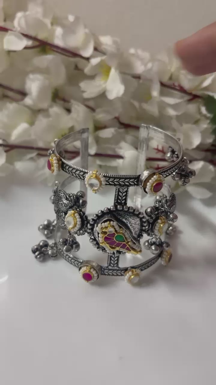 A statement piece that blends tradition with style – this dualtone handcuff features pearl accents and regal kundan stones for a luxurious touch.