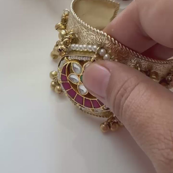 Add timeless elegance to your look with this handcrafted antique bangle, featuring a stunning ruby centerpiece surrounded by delicate white pearls. The floral gold design and openable kada style make it a statement piece perfect for festive occasions and traditional celebrations.