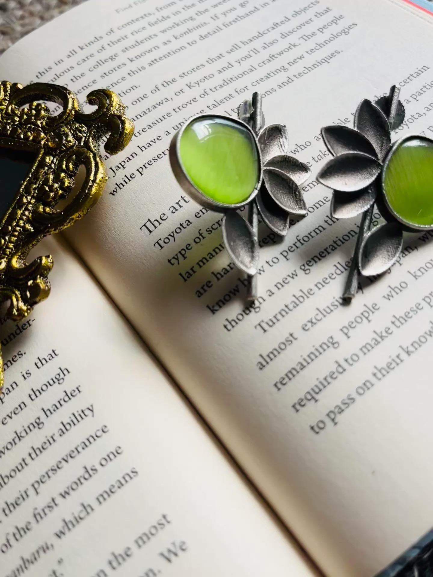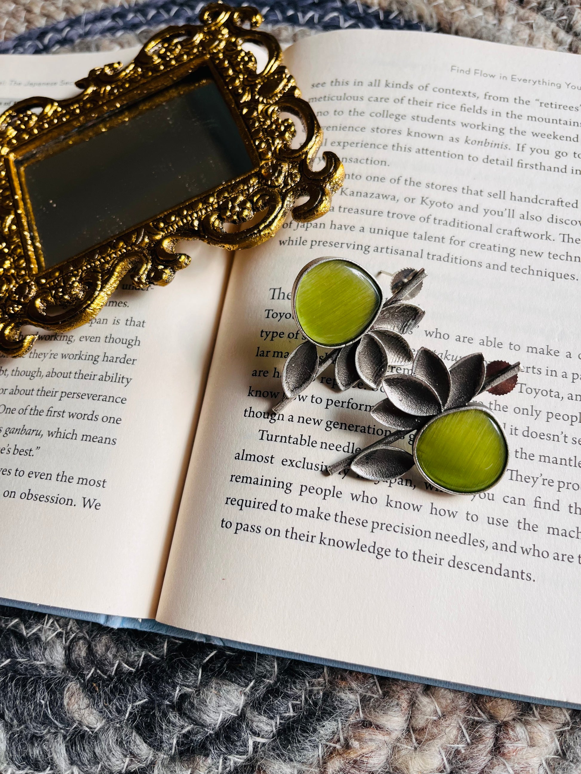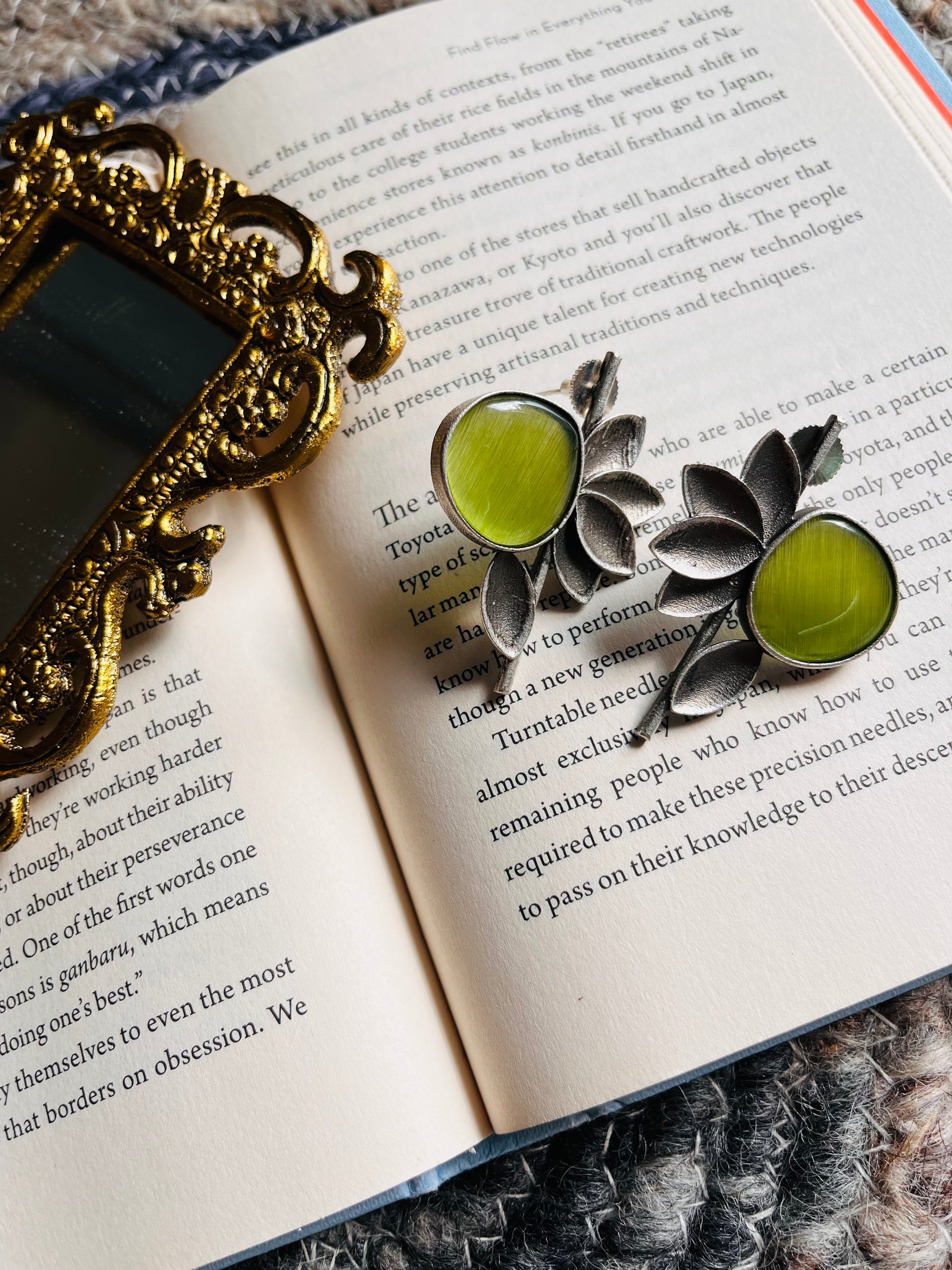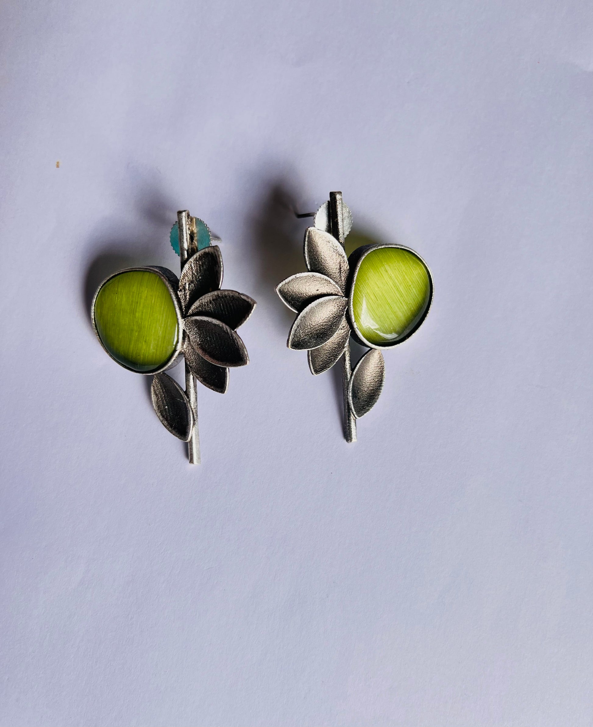 Inspired by the calm of nature and crafted with precision, these leaf-shaped oxidised earrings with a vibrant green centre capture the essence of earthy elegance. Lightweight and statement-worthy.
