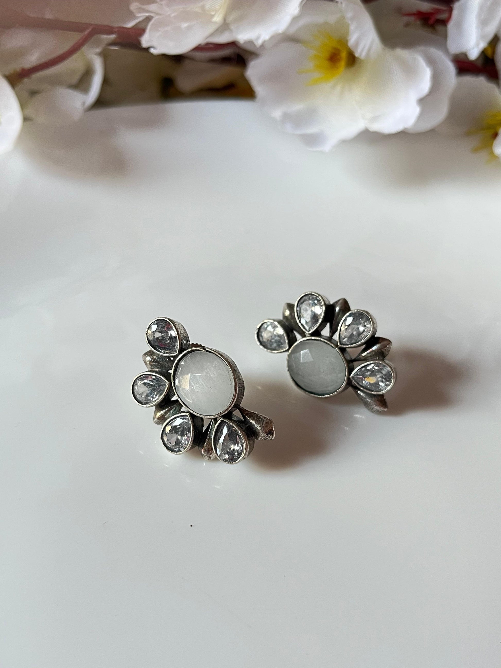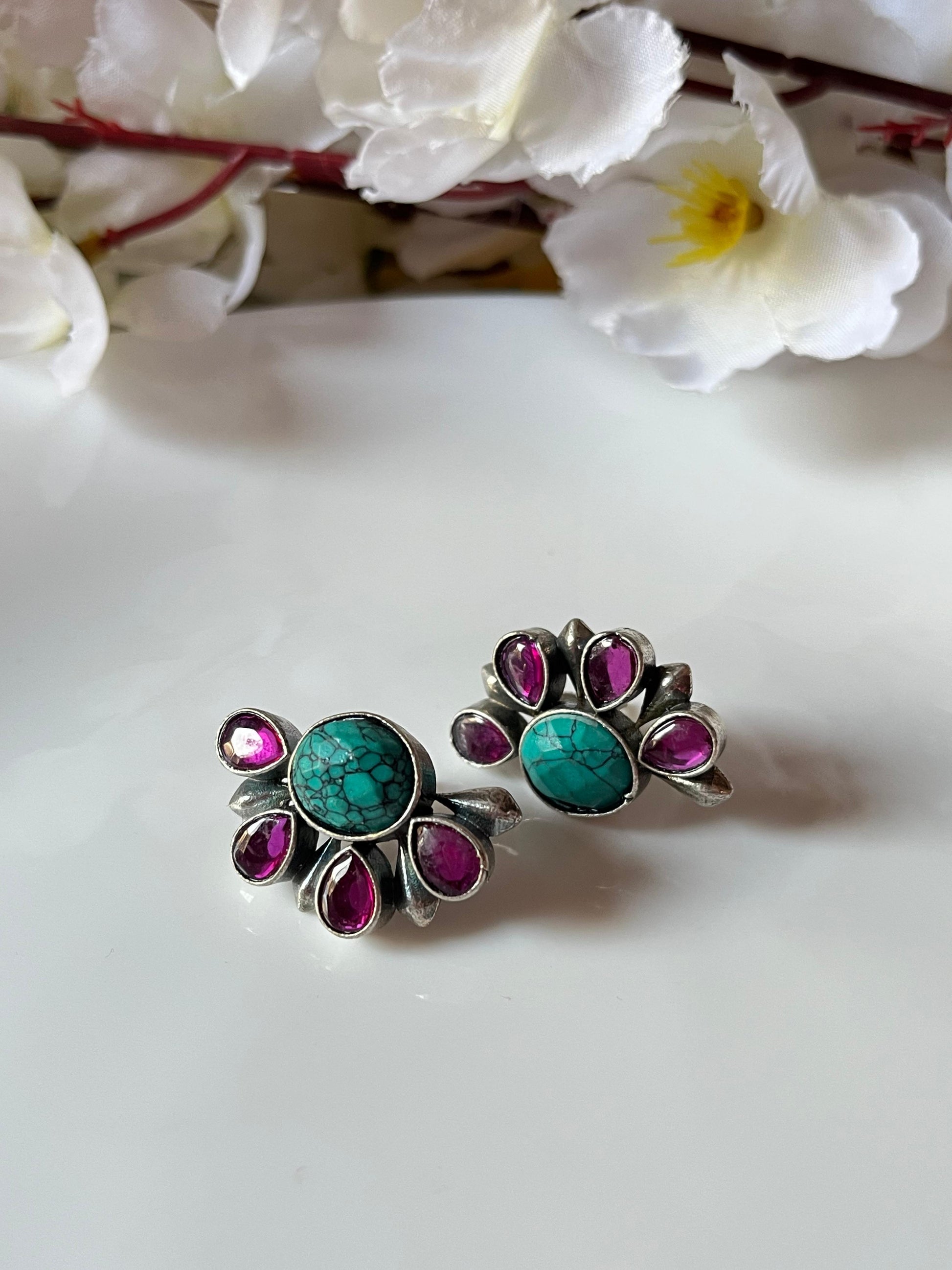 These oxidised silver earrings feature a floral-inspired design with a blend of pink and purple stones, adding charm to any outfit.