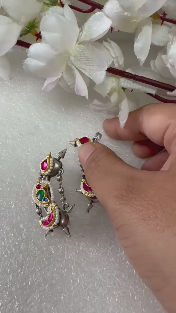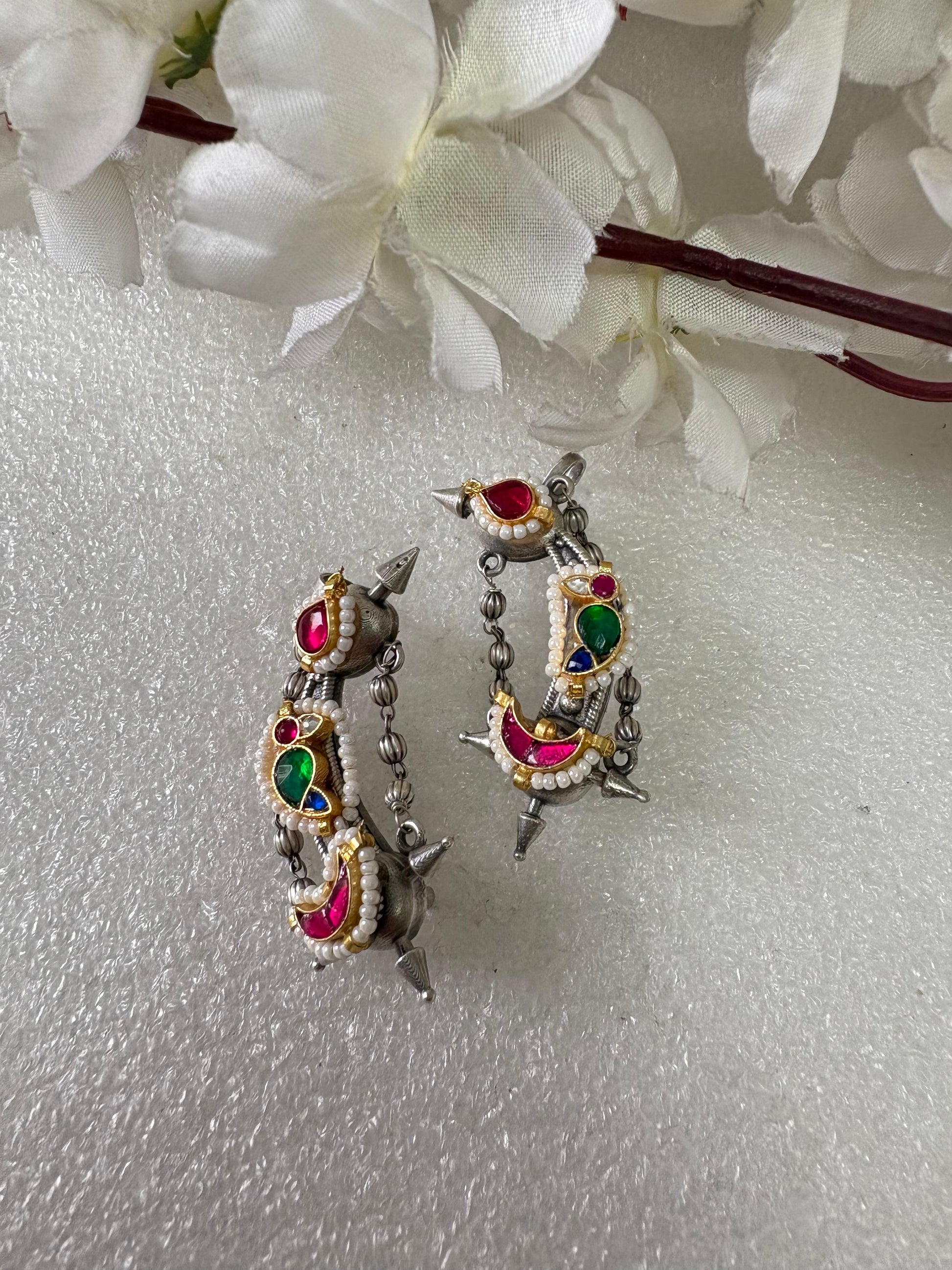 Bring tradition with a twist — these oxidised silver hoop earrings feature vibrant red, green, and blue stones, framed with dainty pearl detailing for a regal charm.