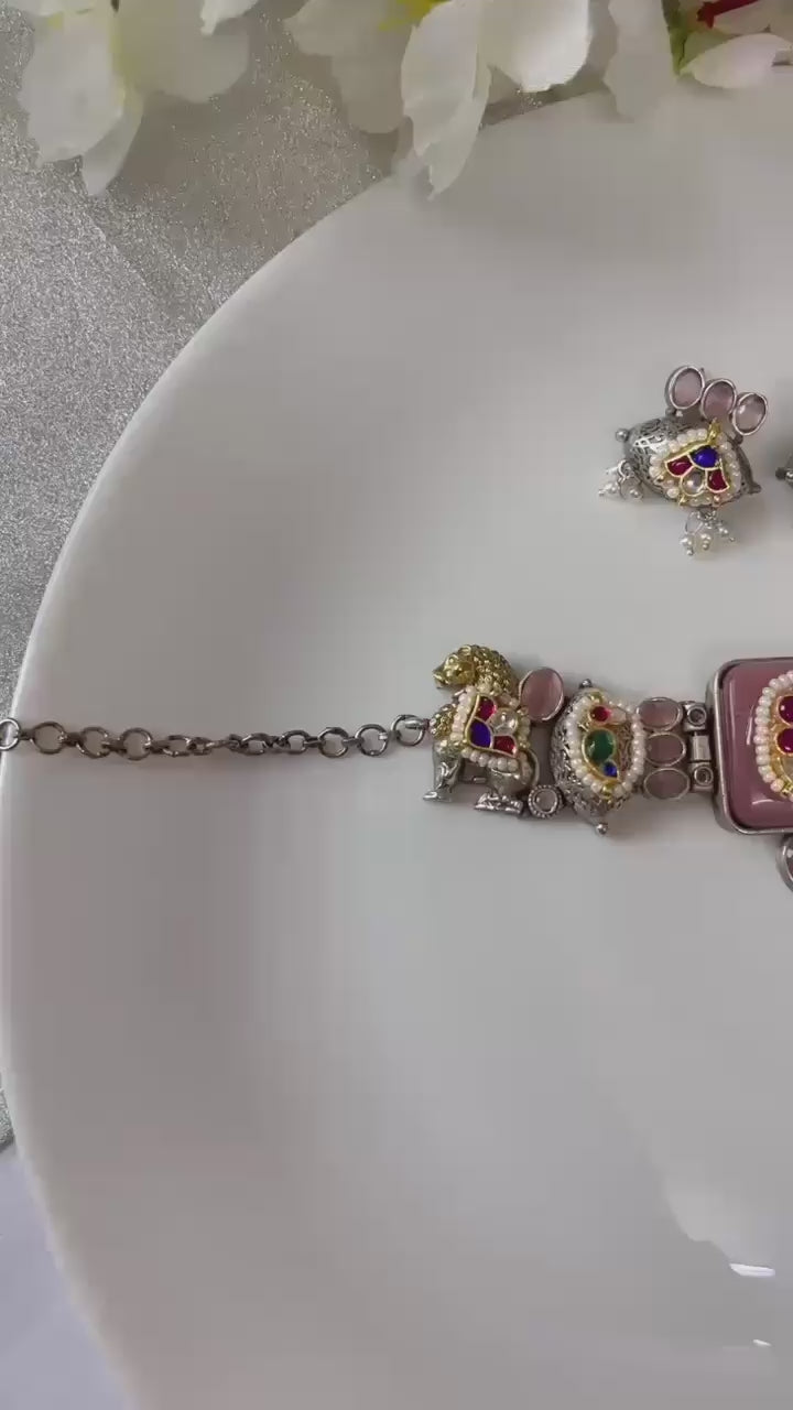 Oxidized silver necklace set with red beads, colorful enamel, pearl danglers, and traditional motifs—perfect for festive and ethnic wear.