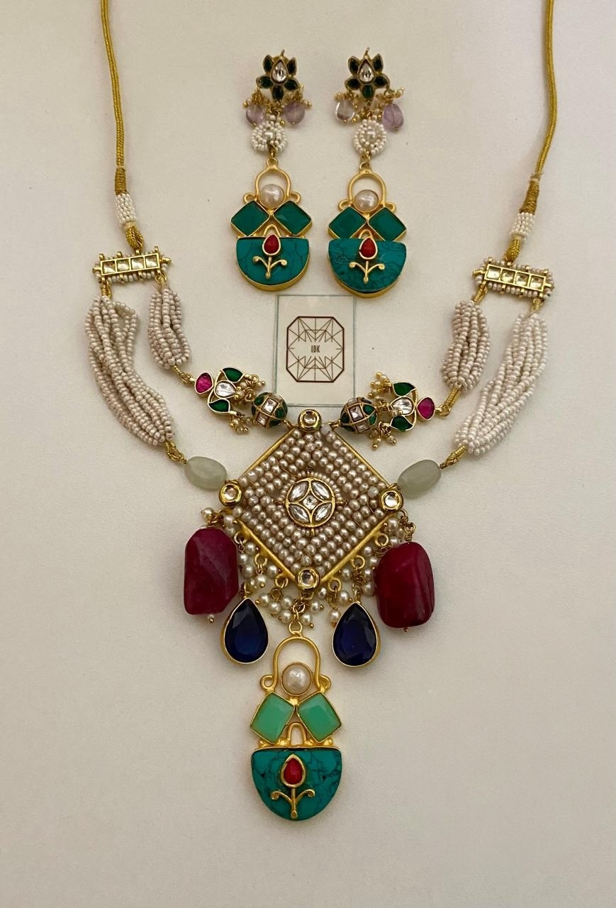 Make a royal statement with this handcrafted necklace set featuring kundan, pearls, and bold multicolor stones. A perfect blend of tradition and elegance for weddings and festive occasions.
