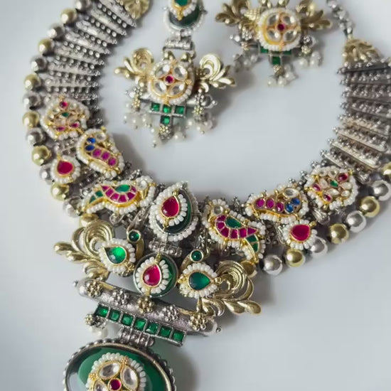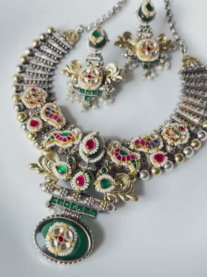 A perfect blend of tradition and elegance – this dual-tone necklace set with intricate Kundan work and handcrafted finish adds timeless beauty to any attire.