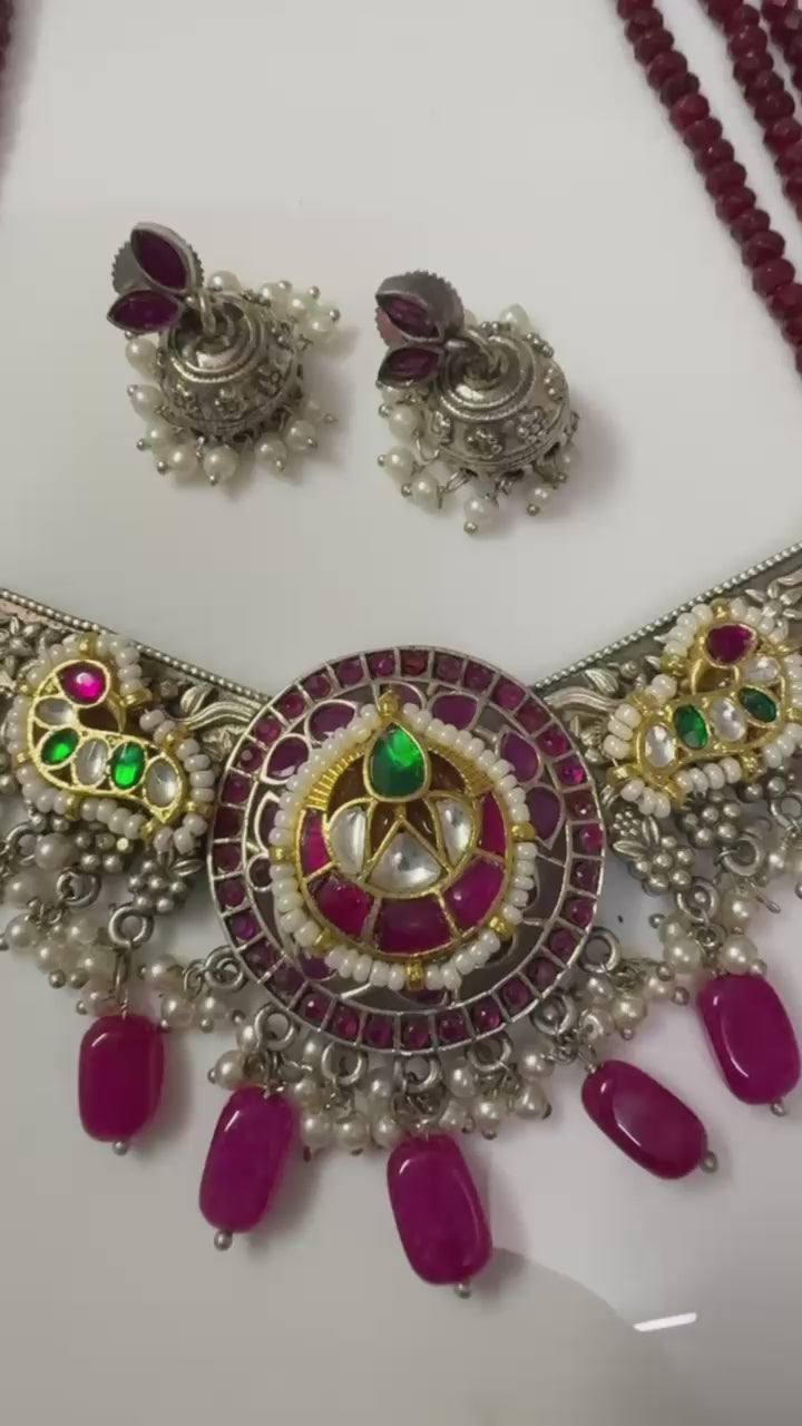 A celebration of heritage with a modern twist β this Ruby Green SLA choker is adorned with radiant kundan stones, fusing royal tradition with contemporary charm. The intricately designed round earrings complete the look, making this set a timeless choice for weddings, festive soirΓ©es, or regal evenings.