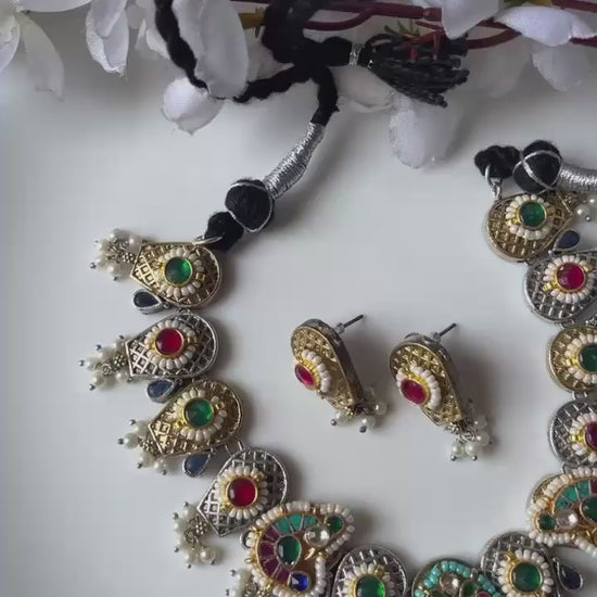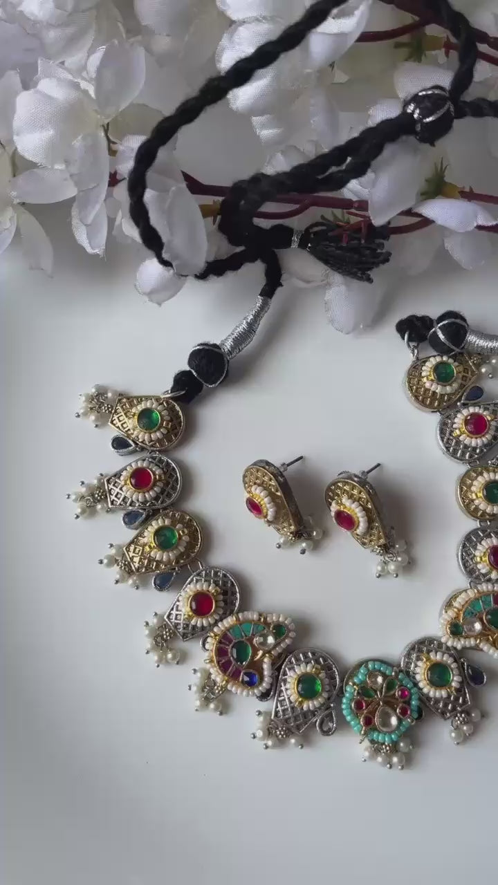 Add a royal charm to your festive look with this oxidized silver choker necklace set, detailed with Kundan, pearls, and floral motifs. Paired with elegant earrings, it’s perfect for Navratri, weddings, and special occasions.
