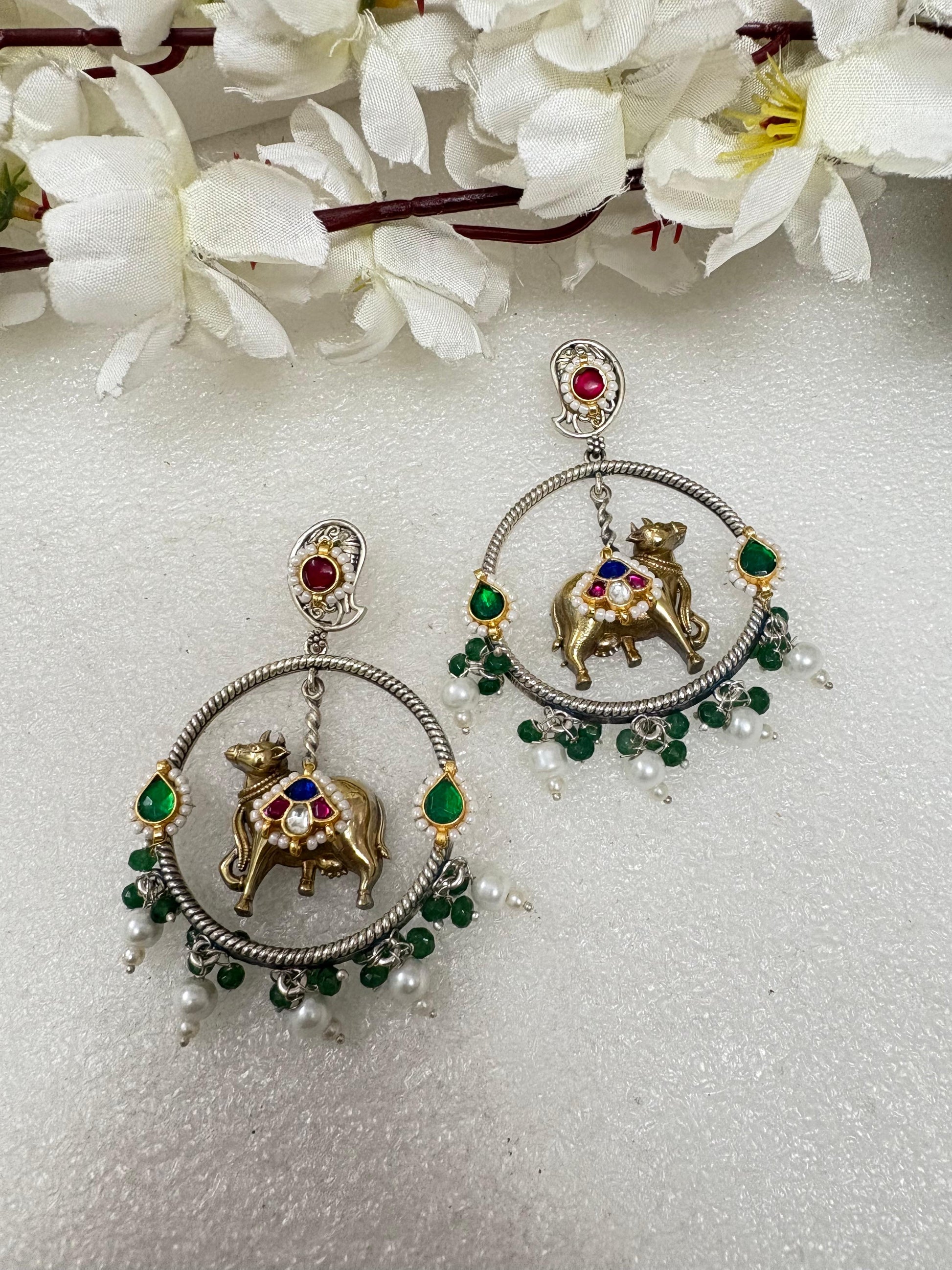 Oxidised Cow Motif Earrings with Green Beads & Pearls
