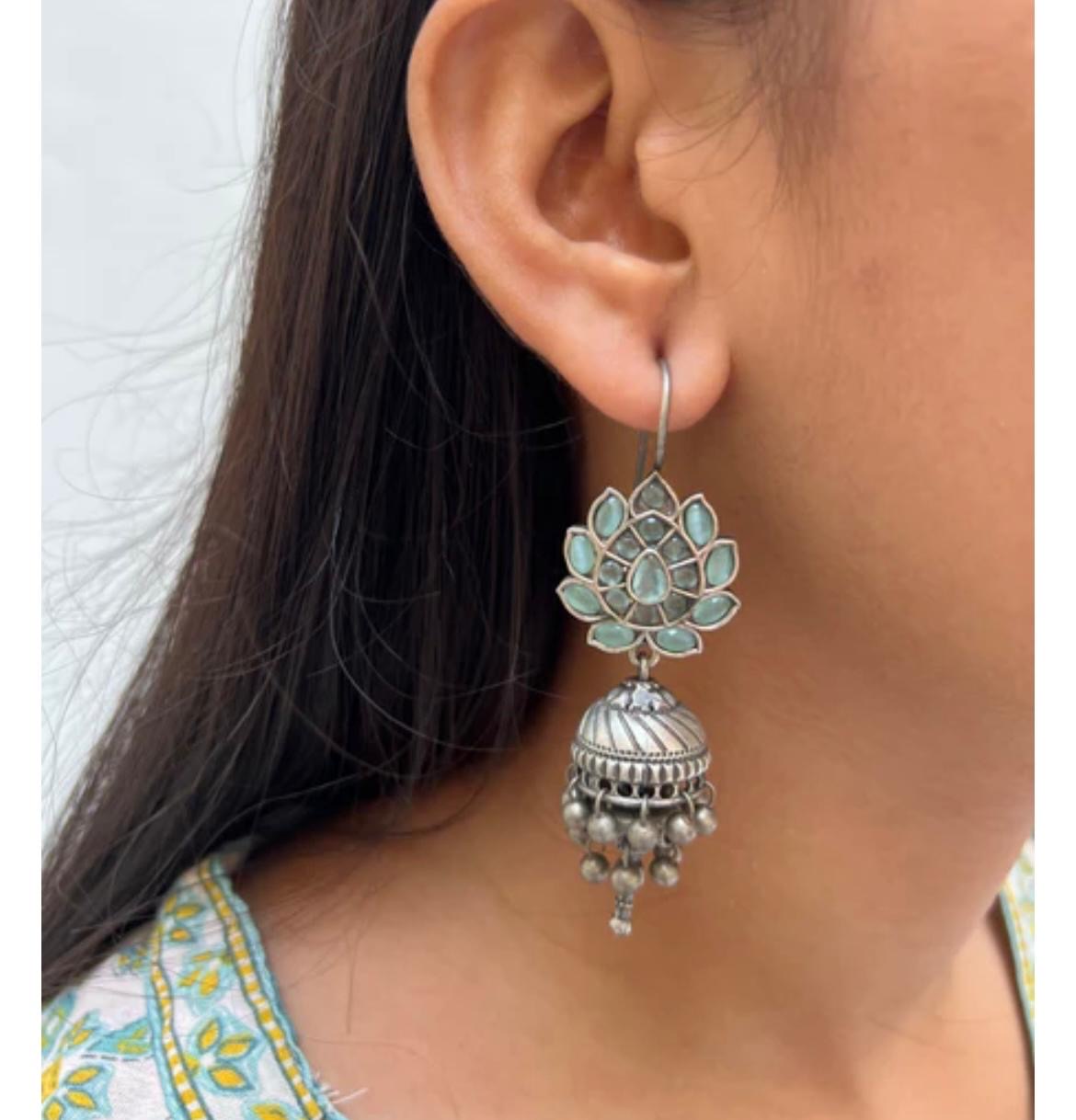 These handcrafted silver plated jhumkas with sparkling white kundan and deep blue stones are designed to complement both traditional and contemporary outfits.