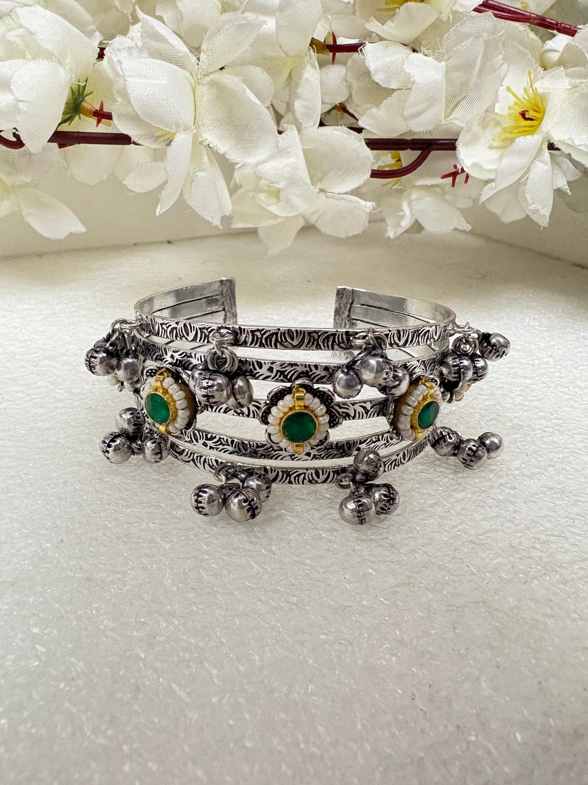 Oxidised Triple-Band Kada with Green Stone & Ghungroo bracelet