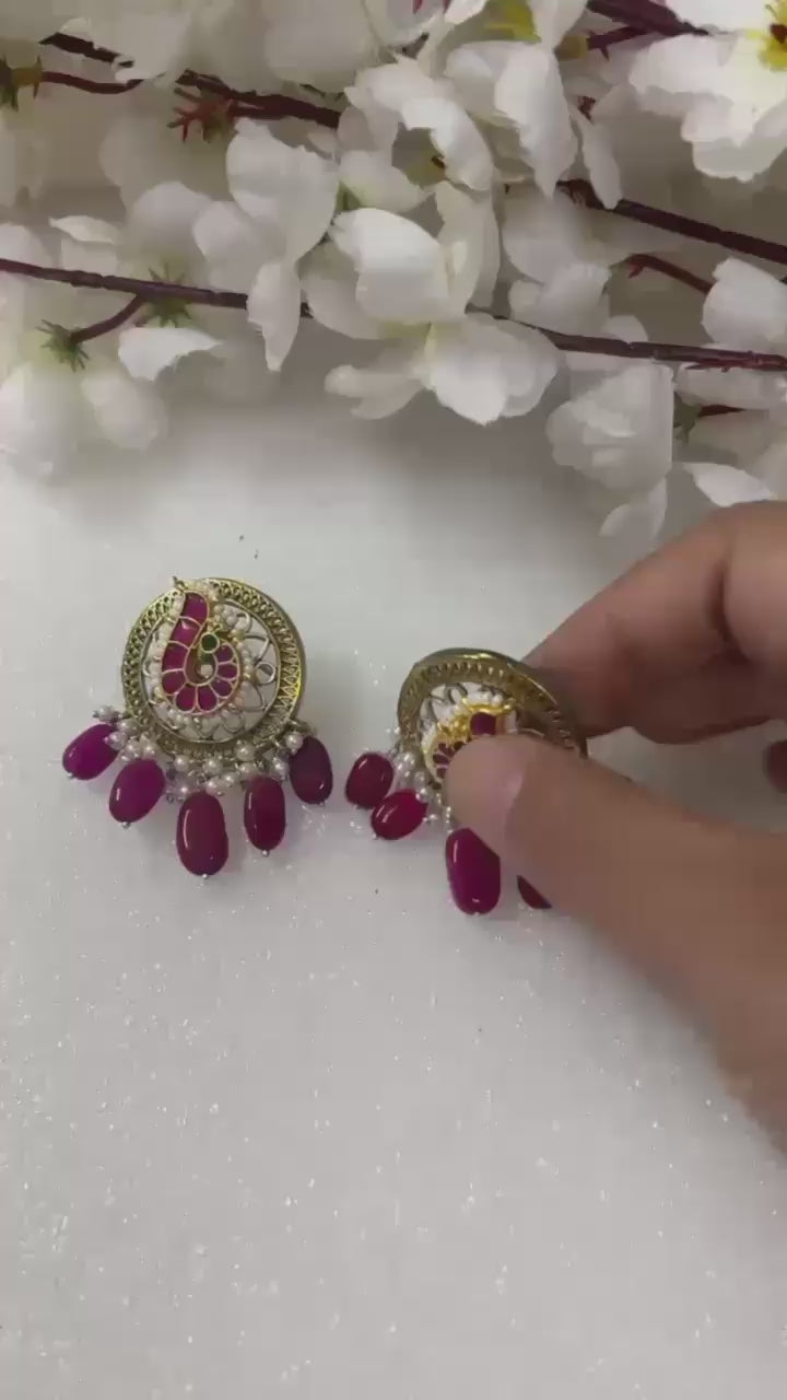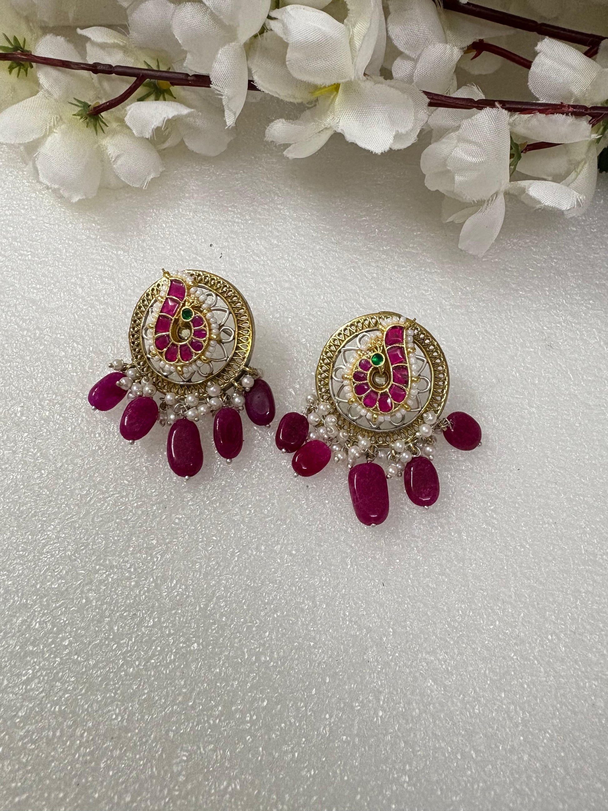 Bold yet elegant, these handcrafted earrings feature paisley motifs, rich pink stones, and a cascade of pearls—perfect for festive and traditional occasions.