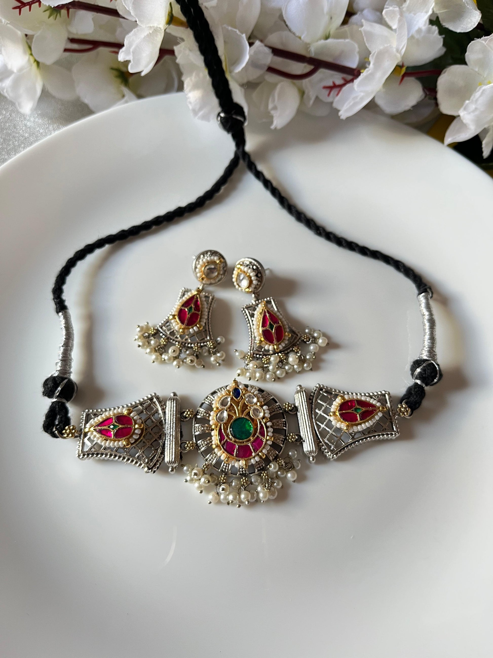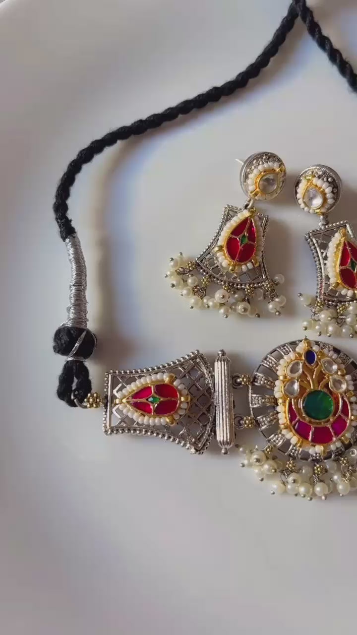 Elevate your ethnic charm with this handcrafted oxidised necklace set, featuring intricate meenakari detailing and delicate pearl drops. Paired with matching earrings, this set adds a royal vintage touch to any traditional attire.