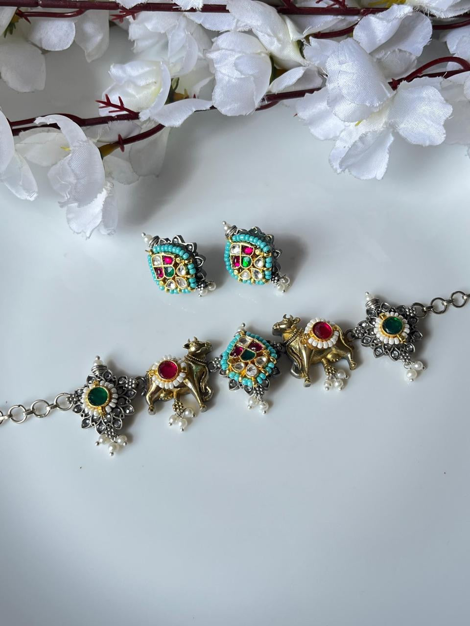 Elevate your ethnic charm with this handcrafted oxidised necklace set, featuring intricate meenakari detailing and delicate pearl drops. Paired with matching earrings, this set adds a royal vintage touch to any traditional attire.