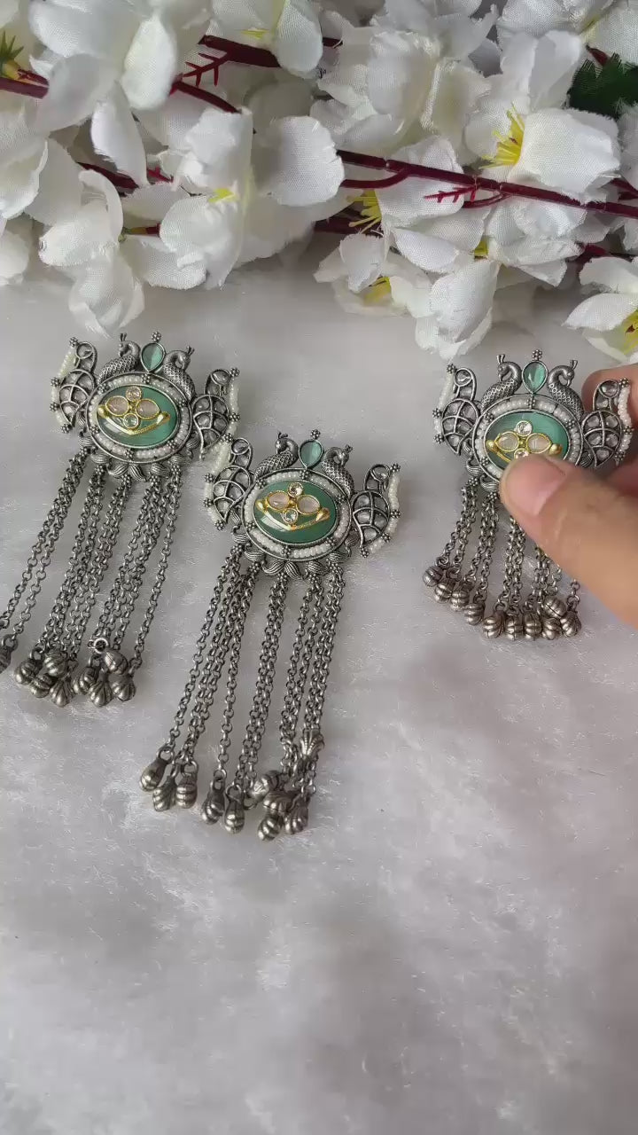 Elegant oxidised silver ring and earrings combo with intricate design, delicate chains, and timeless charm for every festive occasion.
