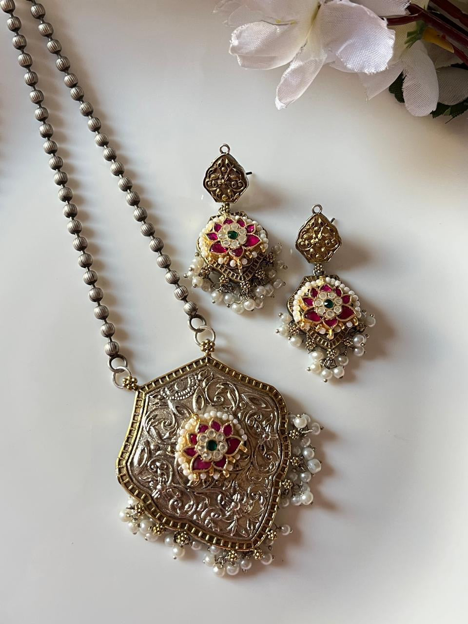 This one-of-a-kind Kashmiri-inspired choker set features a fusion of tribal motifs, pearl chains, and bold enamel work. Ideal for festive wear, weddings, or even with Indo-western outfits to create that unforgettable look.