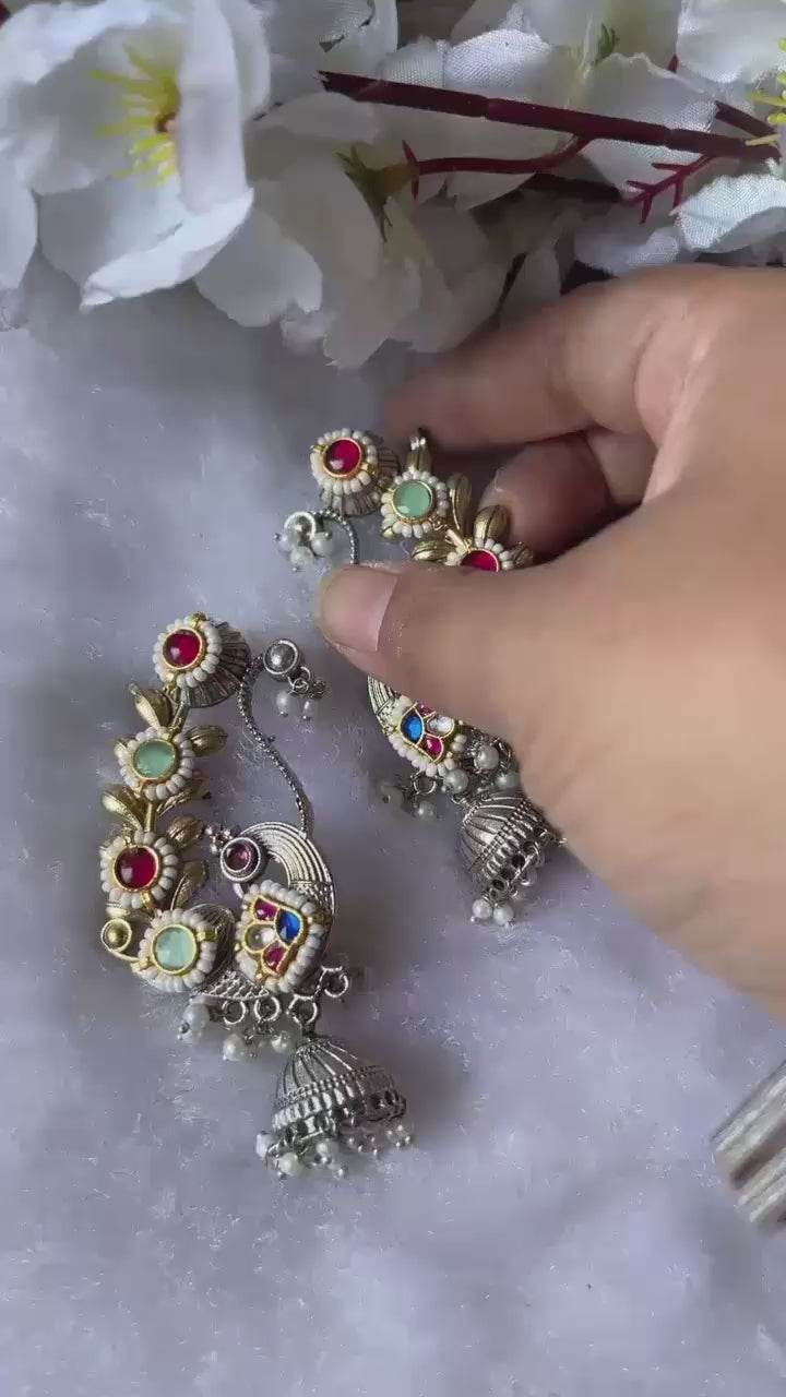 Inspired by royal tradition and peacock elegance, these oxidised earcuffs blend antique charm with colourful enamel accents and ghungroo jhumkas. A versatile accessory to elevate any saree or kurti look.