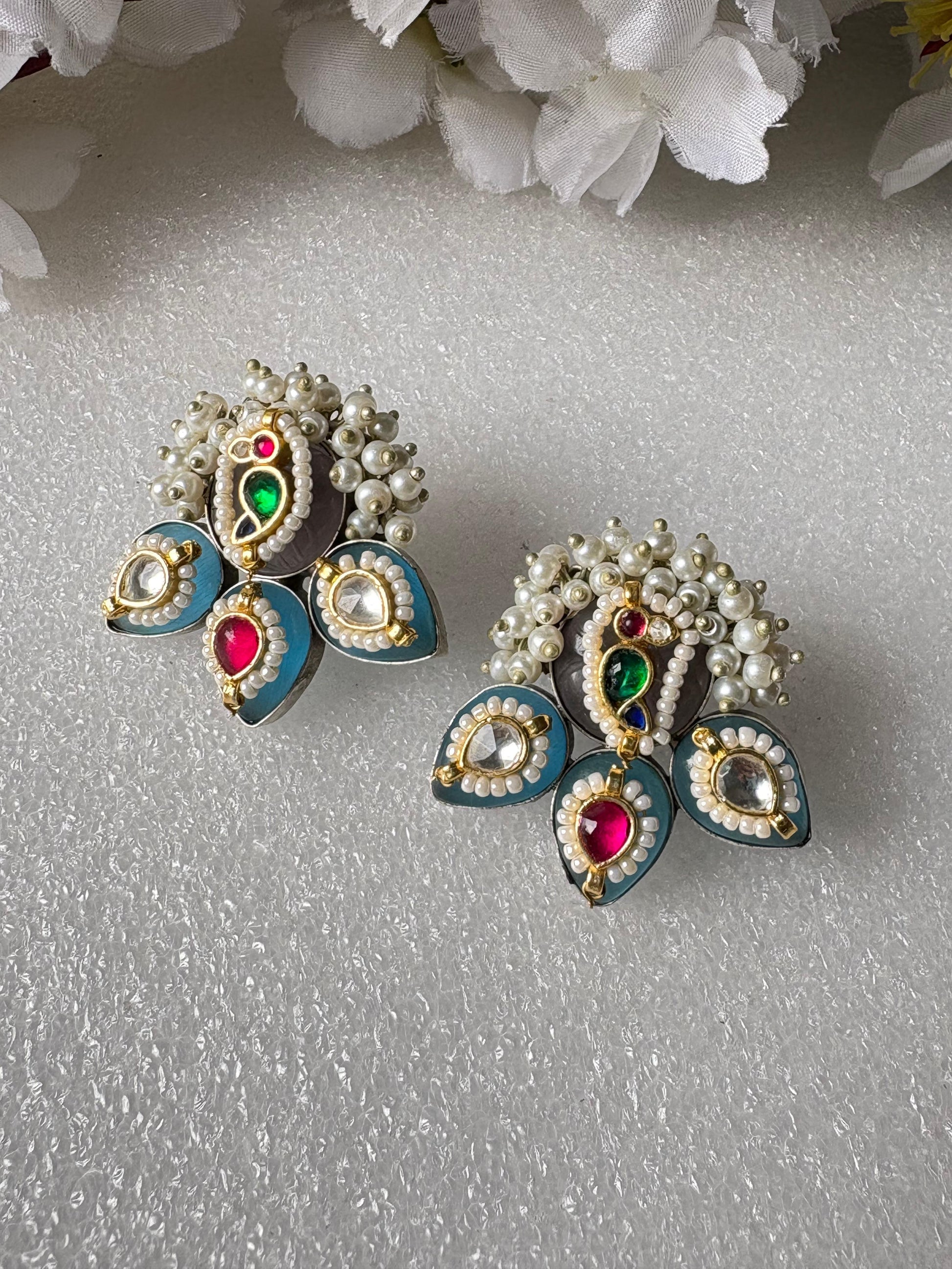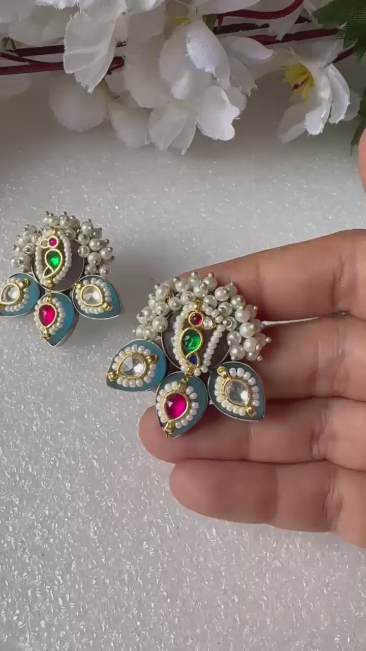 These heritage-inspired jhumkas blend colorful meenakari designs with kundan stones and delicate pearl drops, making them perfect for weddings and festive occasions.