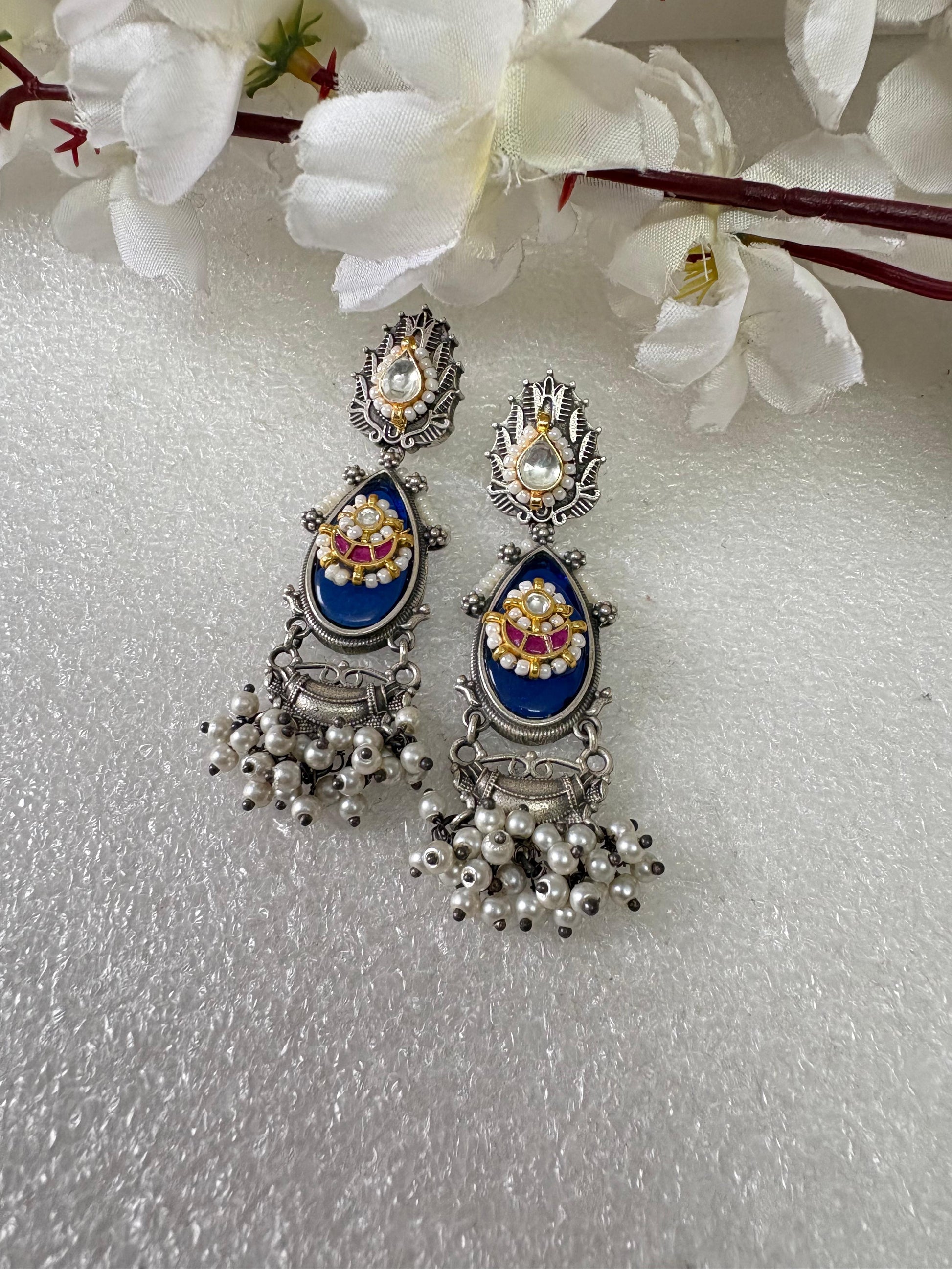 Elevate your look with these oxidised silver earrings featuring intricate blue enamel work, kundan detailing, and delicate pearl clusters for a regal charm.