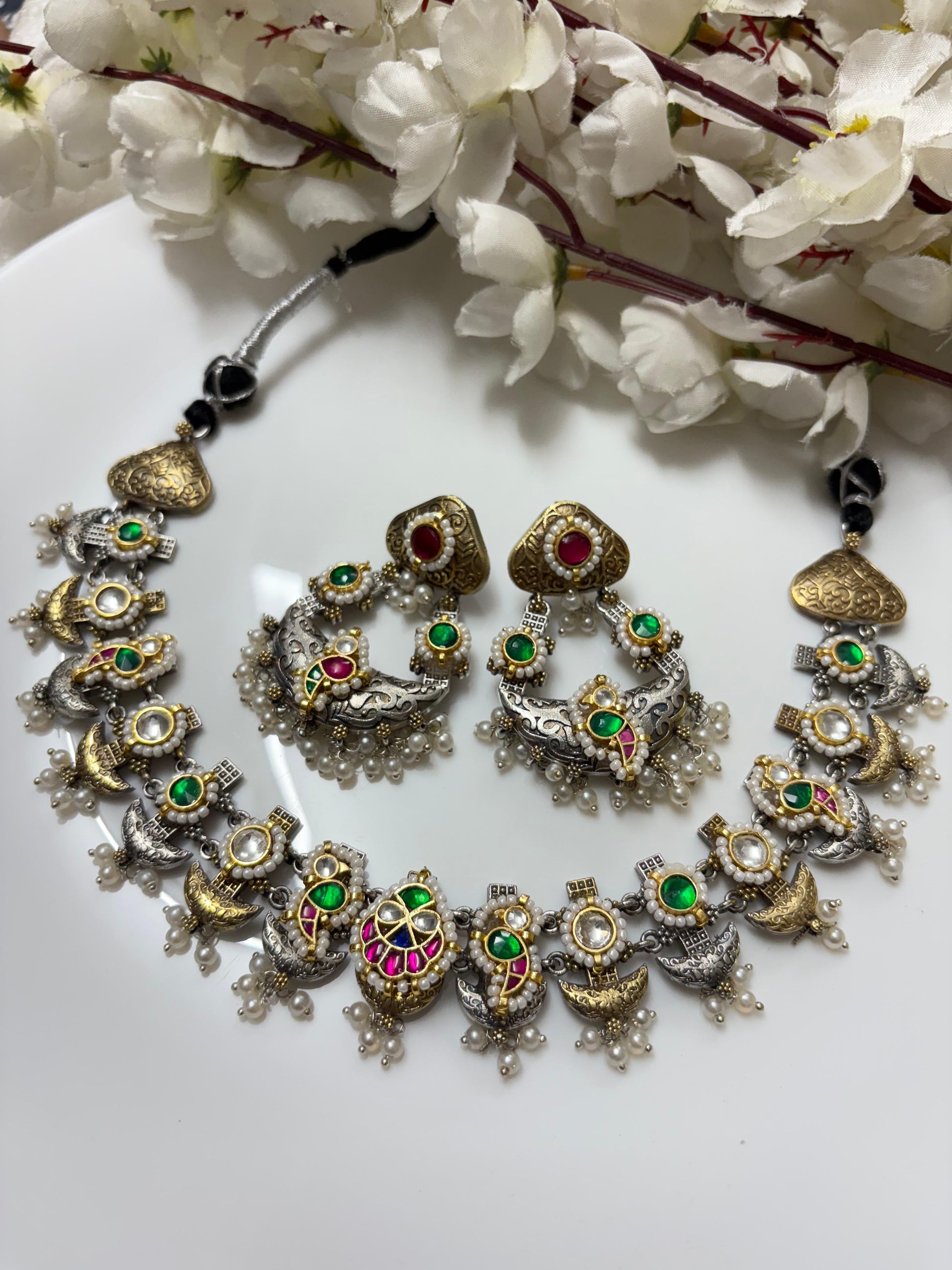 This handcrafted oxidised choker set features intricate meenakari detailing with mirror work and delicate pearl embellishments. A perfect blend of traditional charm and contemporary elegance, ideal for festivals, weddings, and ethnic celebrations.