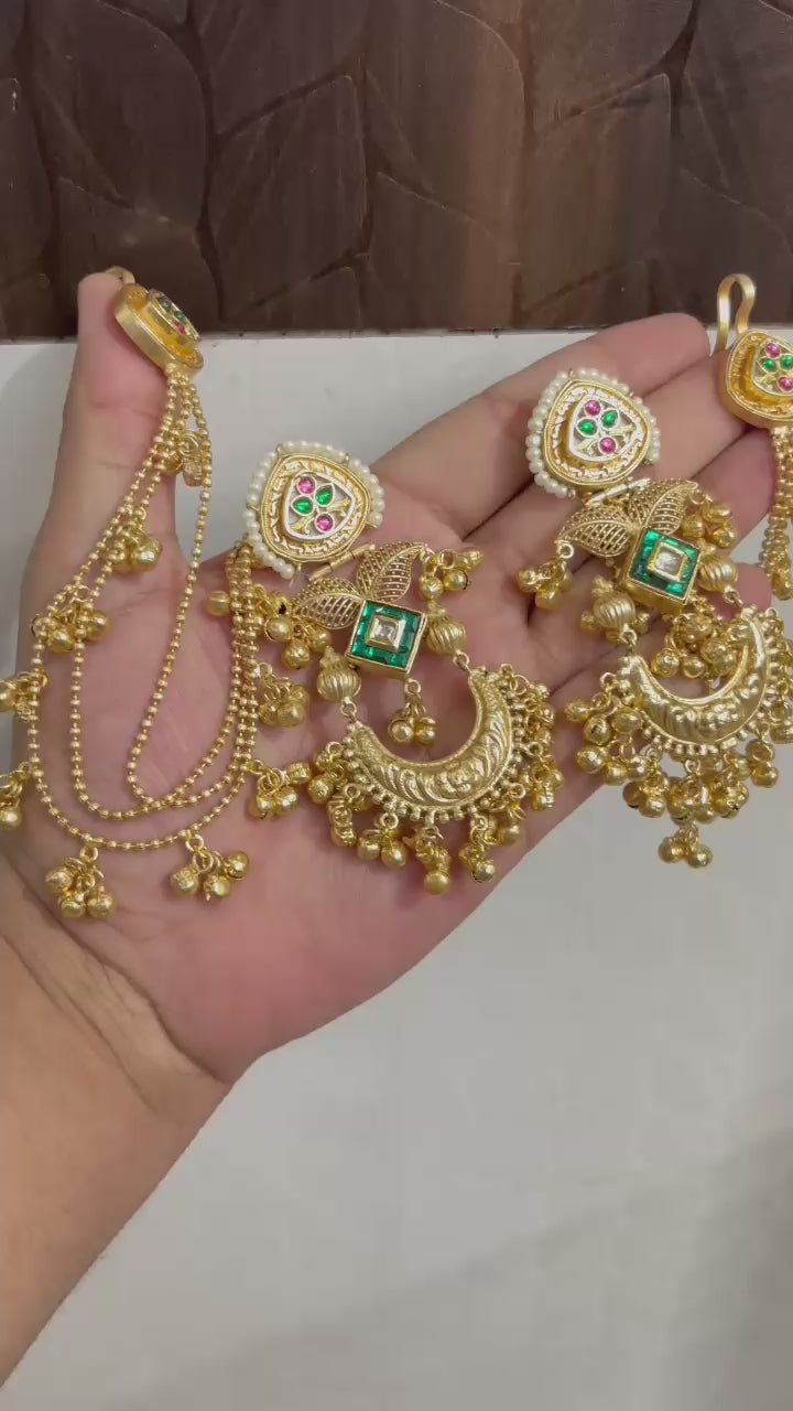 A perfect blend of tradition and elegance, these ear chain earrings are crafted with kundan, pearls, and intricate gold finish for weddings and festivals.