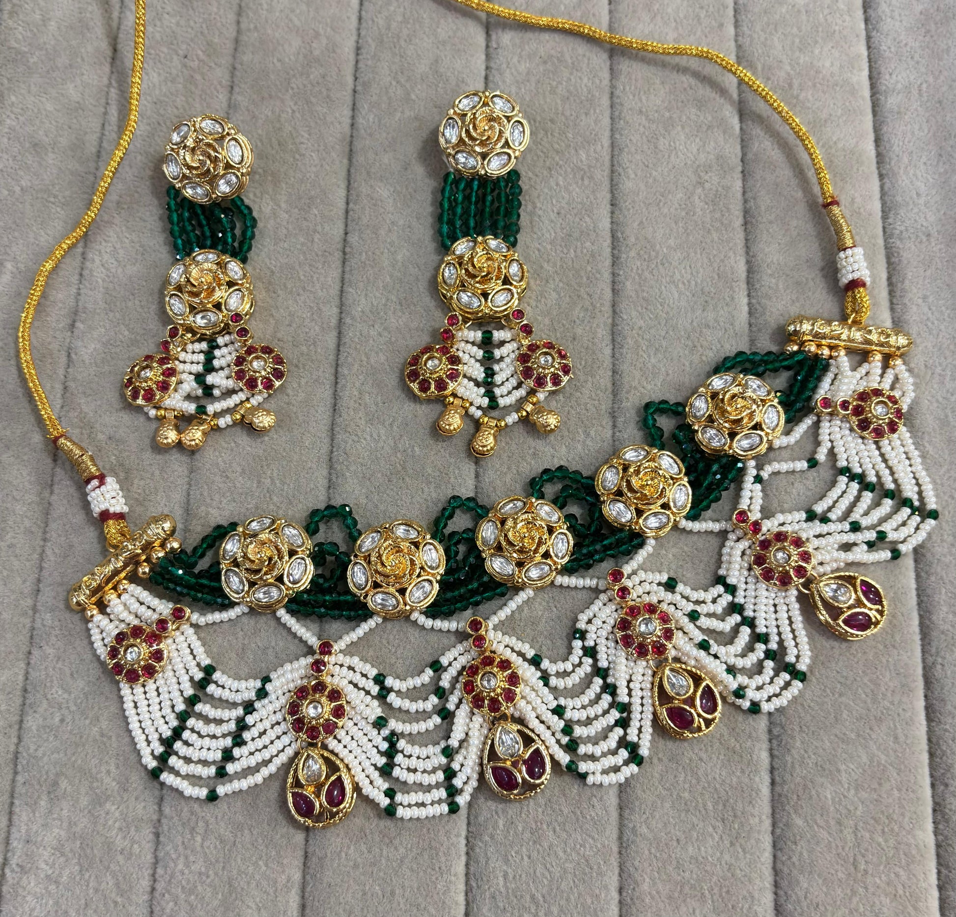 A royal fusion of pearls, green beads, and Kundan artistry, this necklace set captures the essence of Indian heritage. Pair it with sarees, lehengas, or traditional suits for an unforgettable statement look.