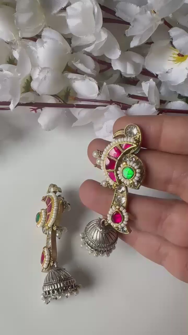 Handcrafted with precision, these Kundan-inspired jhumkas feature vibrant stones, meenakari detailing, and pearl danglers that add a regal charm to any outfit.