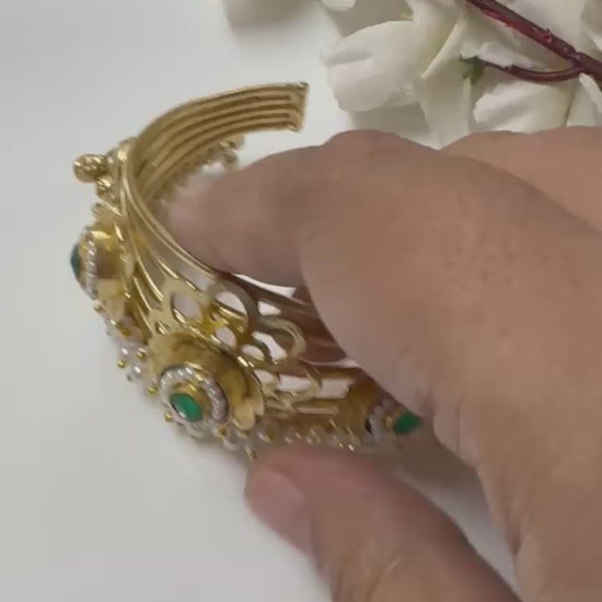 Add timeless elegance to your look with this handcrafted antique bangle, featuring a stunning ruby centerpiece surrounded by delicate white pearls. The floral gold design and openable kada style make it a statement piece perfect for festive occasions and traditional celebrations.