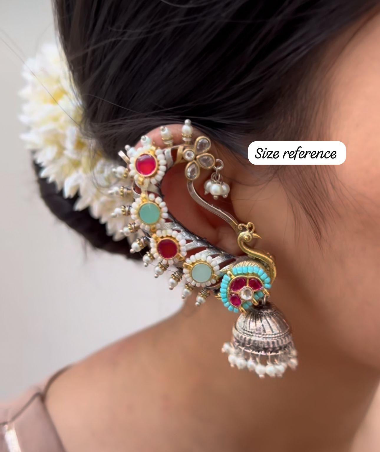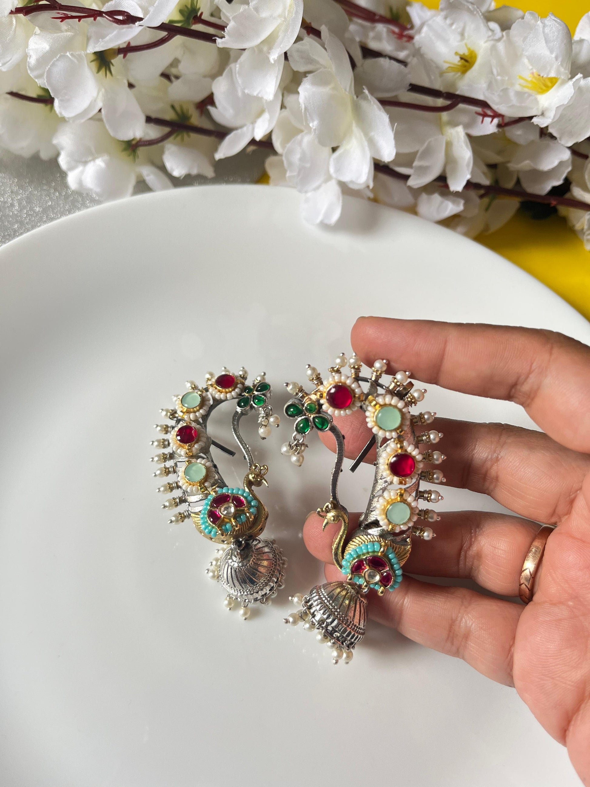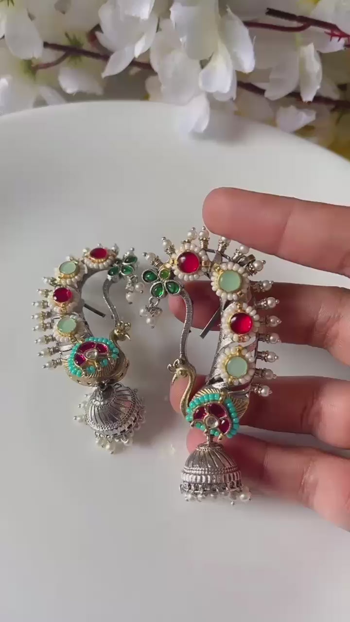 Antique elegance redefined – these crescent-shaped earrings feature kundan, pearls, and vibrant stones, perfect for weddings and festive occasions.