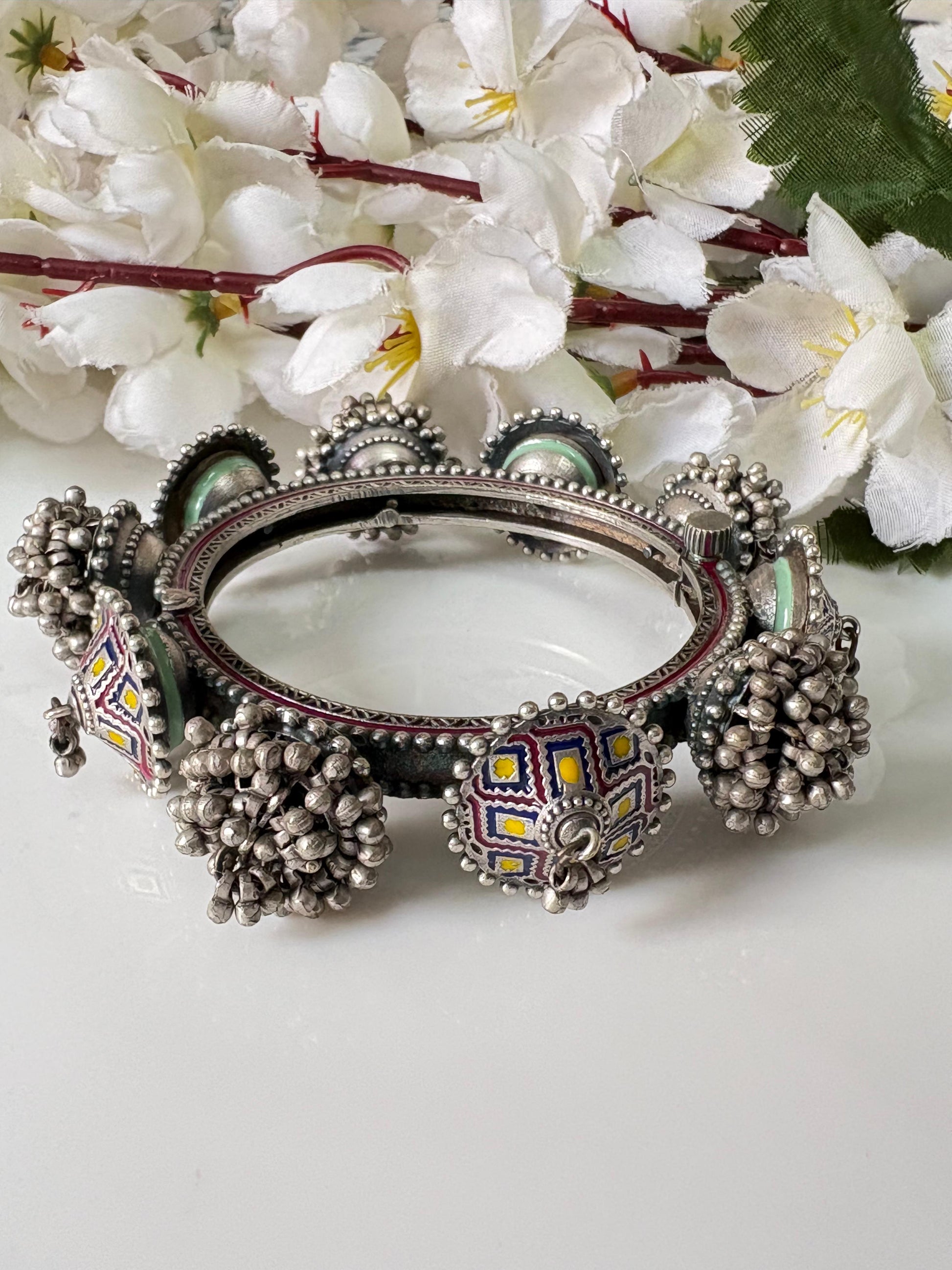 This vintage-inspired oxidised bangle features colorful enamel designs with ornate motifs and ghungroo accents, making it a timeless addition to your ethnic jewellery collection.