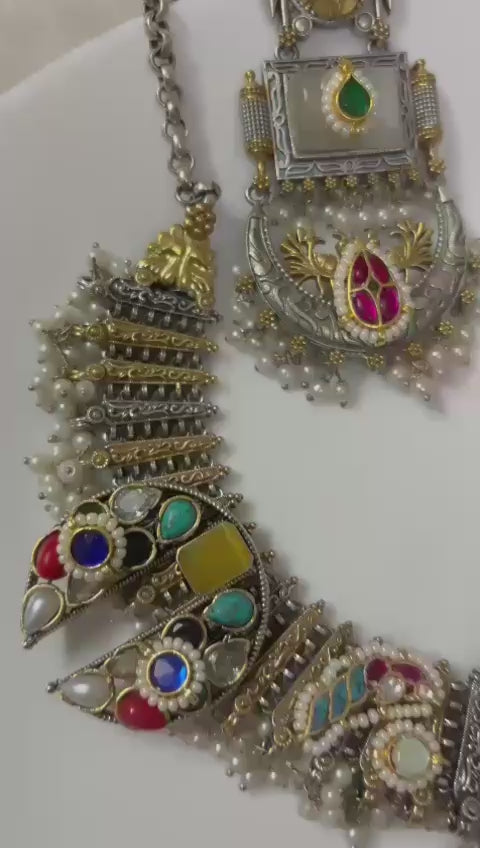 This one-of-a-kind Kashmiri-inspired choker set features a fusion of tribal motifs, pearl chains, and bold enamel work. Ideal for festive wear, weddings, or even with Indo-western outfits to create that unforgettable look.