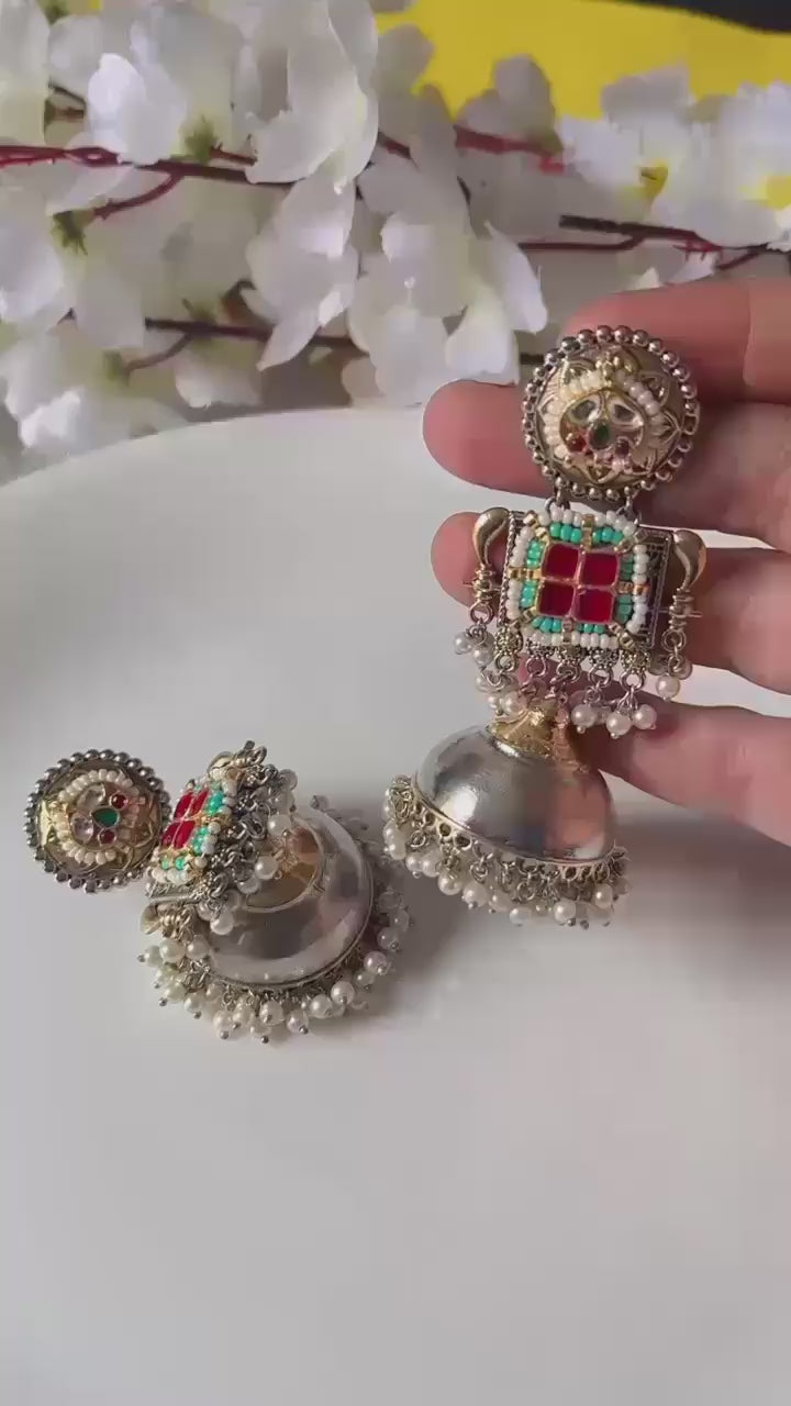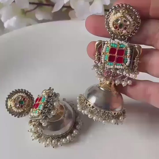 Elevate your festive look with this royal handcrafted jhumka, featuring intricate kundan detailing, vibrant beads, and delicate pearl drops. A perfect fusion of traditional artistry and timeless elegance.