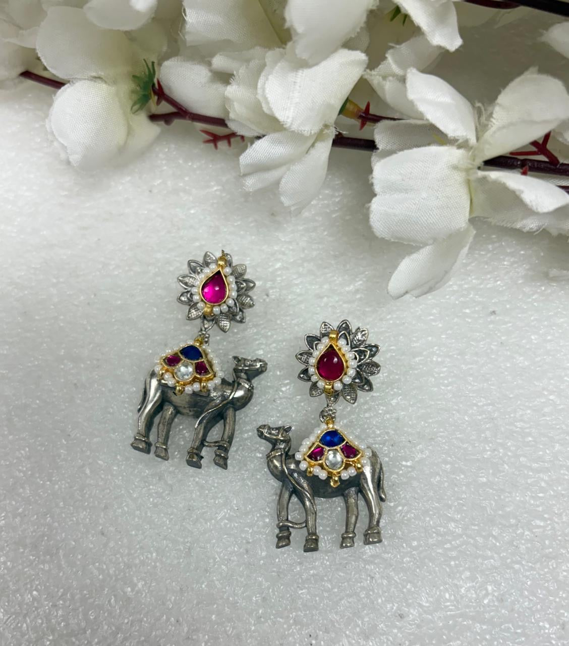 Elegant oxidised silver earrings with intricate elephant motifs, ruby-red stones, and dangling chains for a graceful ethnic charm."