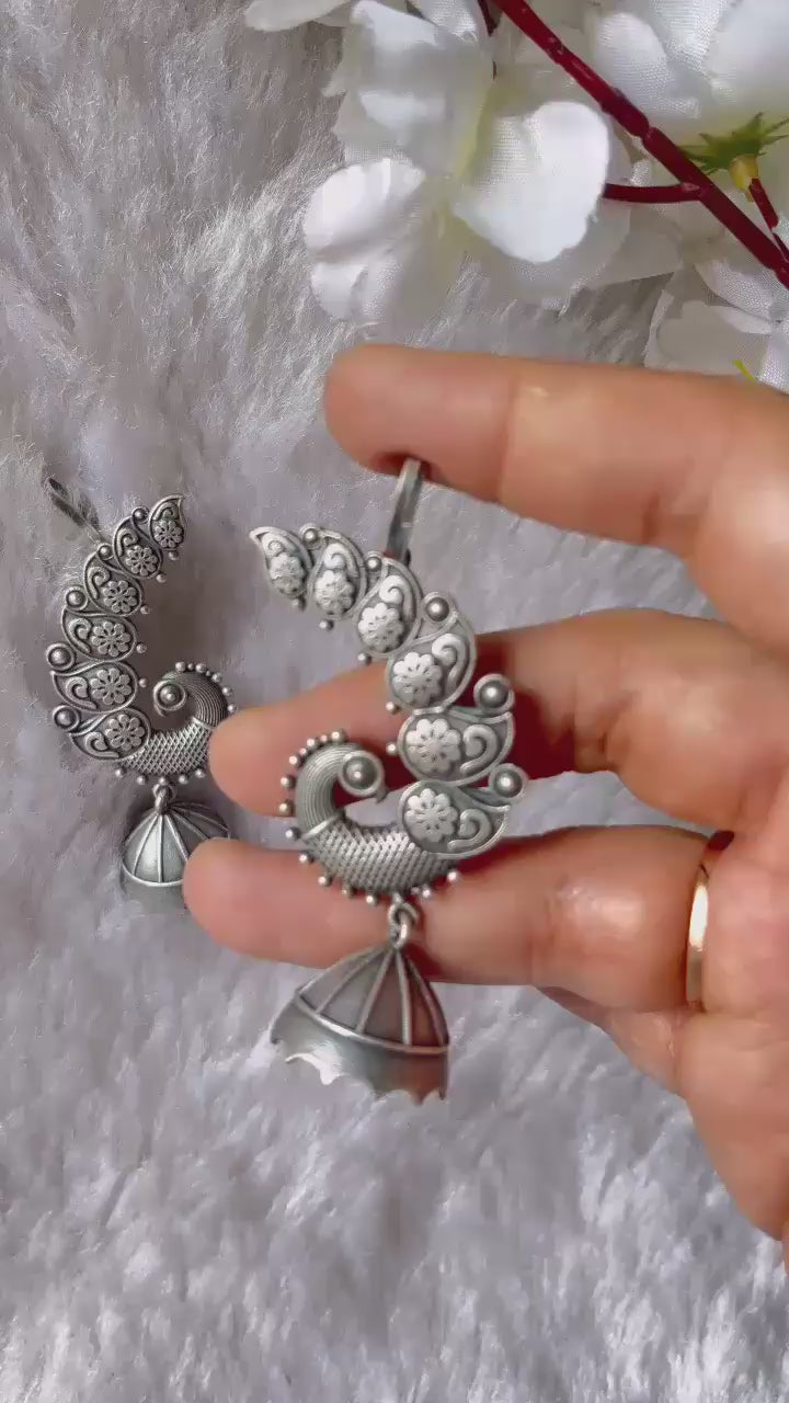 Grace your look with these intricately designed oxidised peacock earrings, featuring floral motifs and a charming dome-shaped jhumka. Perfect for ethnic and fusion outfits, they bring timeless elegance with a touch of tradition.