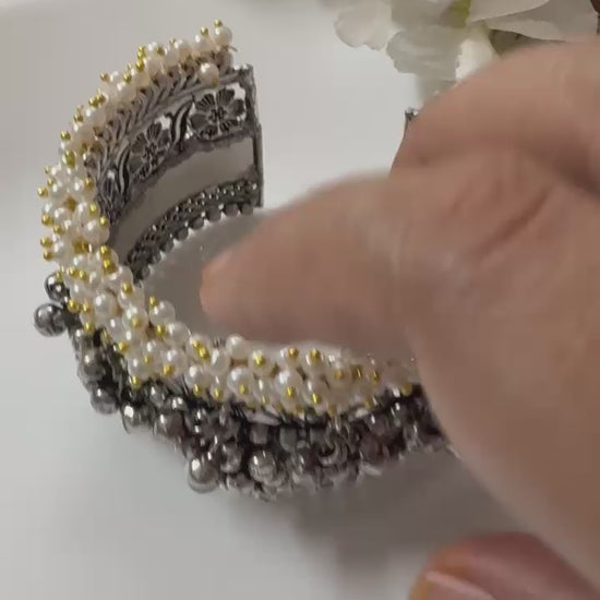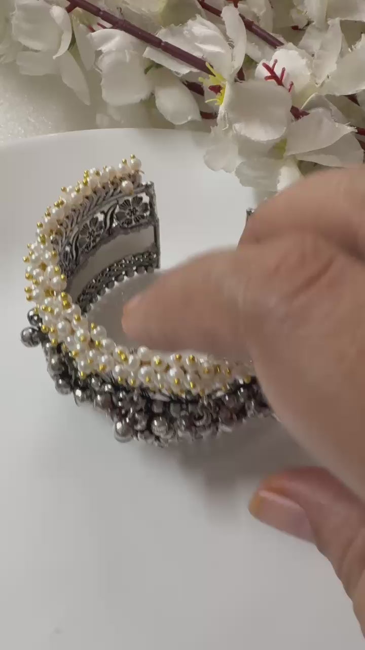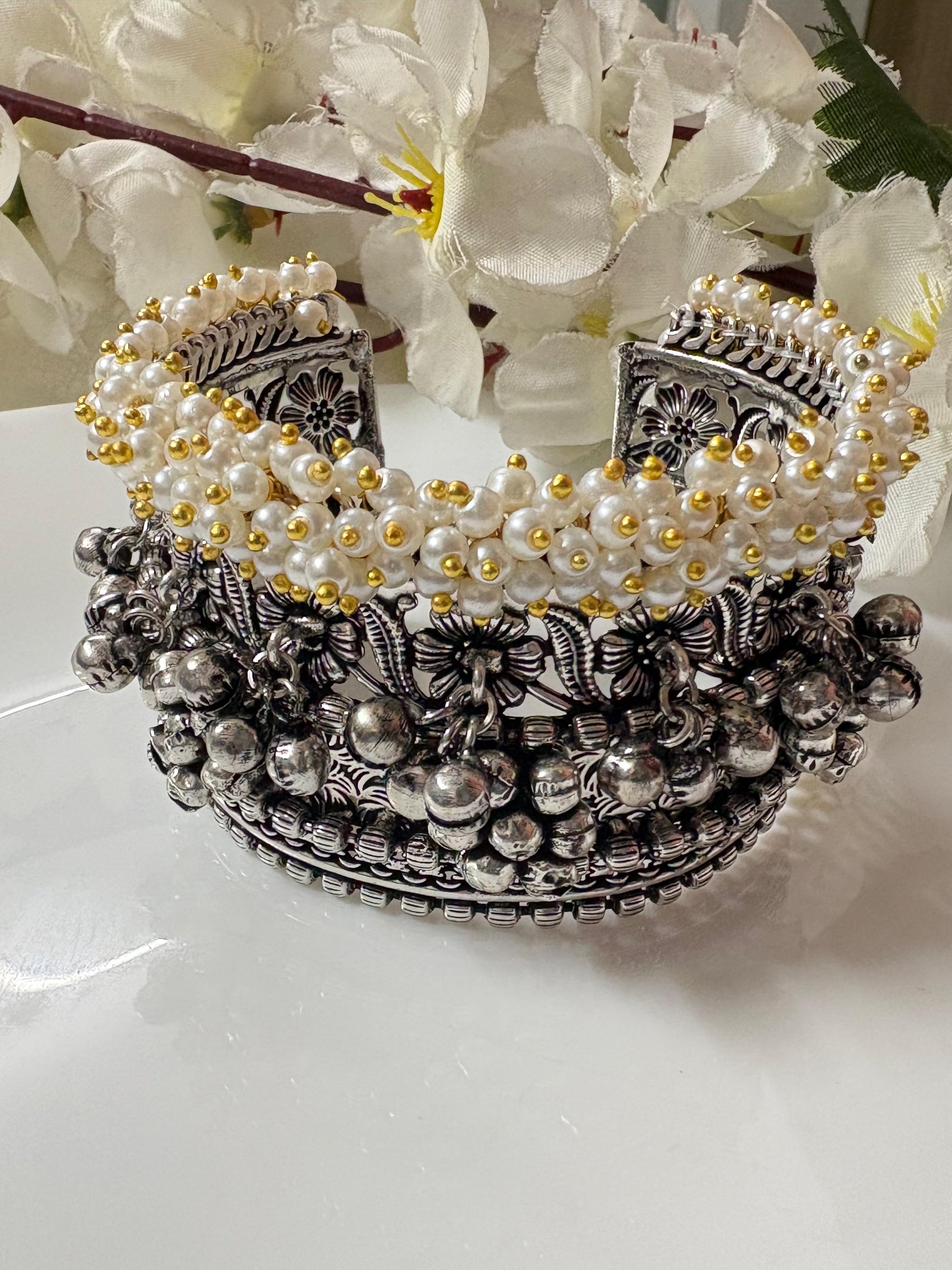 Crafted in premium German silver, this pearl-studded cuff adds a touch of grace to your festive & party look.