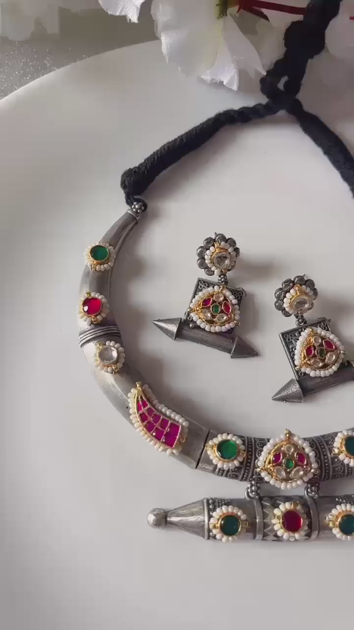 Oxidized silver necklace set with red beads, colorful enamel, pearl danglers, and traditional motifs—perfect for festive and ethnic wear.